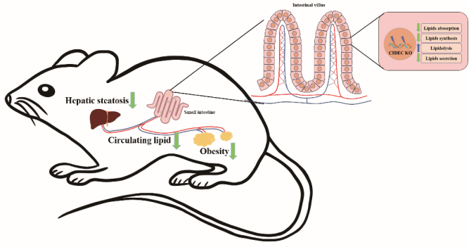 脂滴结合蛋白CIDEC的主要功能是抑制脂质分解,促进细胞内脂质积累和单室脂滴形成。肠道是外源性脂质的主要消化吸收场所,在机体脂代谢平衡中扮演关键角色。本研究通过肠道特异性敲除CIDEC探究不同饮食条件下肠道CIDEC对机体脂代谢的影响及其作用机制。结果显示,肠道特异性敲除CIDEC减少肠道对脂质的吸收,有效缓解饮食诱导的肥胖和肝脂肪变性。