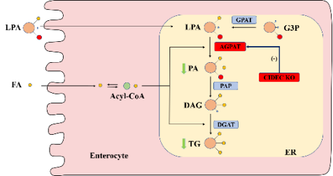 机制研究表明,CIDEC与AGPAT互作,肠道特异性敲除CIDEC降低AGPAT催化的磷脂酸水平,抑制甘油磷酸途径参与的甘油三酯合成。