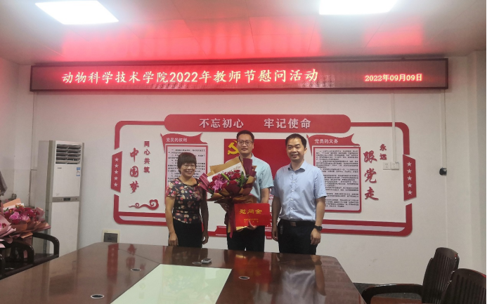 2022年9月9日上午,我院在学院302会议室举行2022年教师节慰问活动,学院党委书记顾慕娴、常务副院长陆阳清慰问了我院教职工代表胡传活、蒋钦杨、李辉和苏接瑜,向他们送上鲜花和慰问金,并通过他们向全院教师致以节日祝贺问候和美好祝愿。副院长宁鹏飞、何家康和韦祖樟及学院各部门代表参加了本次慰问活动。(图/罗敏芳 文/李爱友)