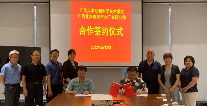 2022年6月2日下午,太阳成集团122ccvip(以下简称“我院”)与广西北海市鮪丰水产有限公司(以下简称“广西鮪丰”)签订共建“产学研”合作基地框架协议,双方将本着优势互补、资源共享、共同发展的原则,加强水产养殖人才培养、太阳成集团和技术推广等方面的交流与合作。