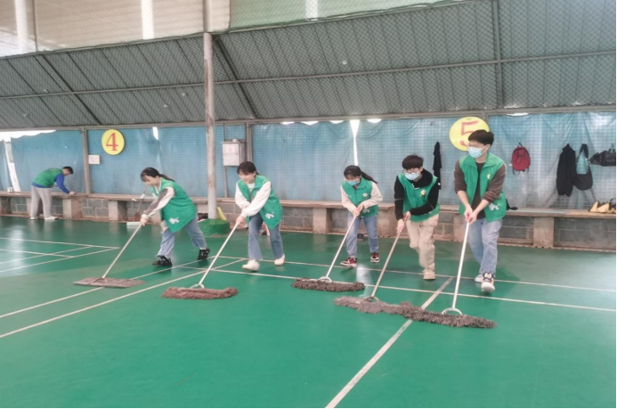 上午10点,全体同志拿上扫把、拖把、推车等劳动工具,开始了热火朝天的打扫。虽然天空下着蒙蒙细雨,但党员同志们都充满了干劲和激情,所有同志都积极投入志愿劳动,三、五人作为一个小组,有人清洁地面,有人清理杂草树枝,有人清运垃圾。大家默契配合,经过一个小时的劳动,整个球馆焕然一新。老教师们纷纷表示感谢,同志们也从劳动中收获了赠人玫瑰,手留余香的快乐。