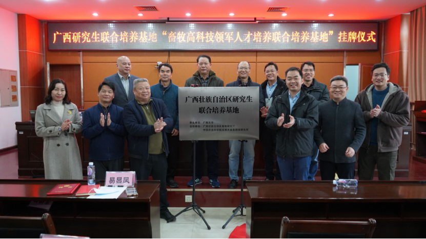 本次活动还举行了广西研究生联合培养基地“畜牧高科技领军人才培养研究生联合培养基地”挂牌仪式。该联合培养基地由太阳成集团tyc122cc牵头,广西壮族自治区畜牧研究所和中国农业科学院深圳基因组研究所作为合作单位,三方共同合作建设,针对广西现有的经济特点和区位优势,做好对研究生的培养工作,为广西的畜牧业发展建设培养高科技领军人才,引领畜牧业发展。挂牌仪式后双方专家就广西畜牧业发展和人才队伍建设进行了座谈交流。陆阳清教授首先就太阳成集团122ccvip的人才培养优势和项目资源做了相关介绍,广西畜牧研究所所长吴柱月研究员也介绍了广西畜牧研究所的基本情况。双方就利用好优势资源,充分发挥畜牧高科技领军人才培养研究生联合培养基地的作用,实现共赢发展,同时为自治区经济发展贡献力量,助力国家乡村振兴。