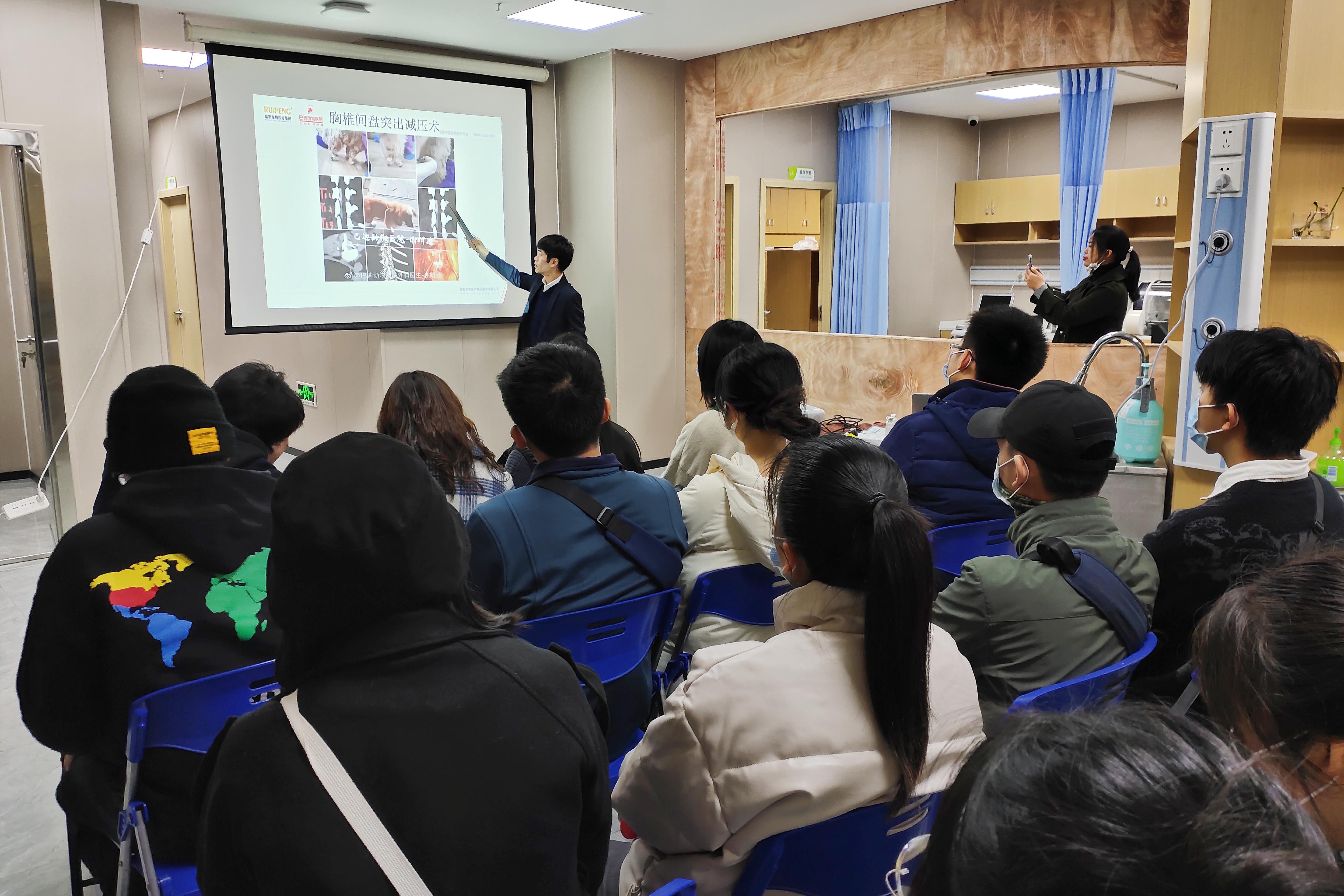 谢明迪医师通过分享输尿管损伤、下颌关节粘连、胸椎间盘突出、先天性横膈心包疝、坏死性角膜炎、粉碎性骨折等特殊病例的治疗过程,给师生们细致介绍了外科、骨科、内科、眼科等宠物诊疗要点和技术操作关键。