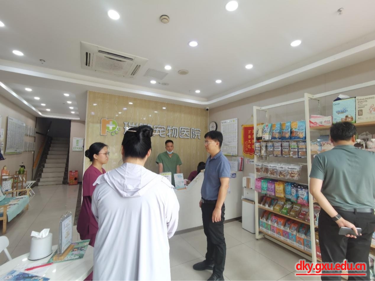 第二站,韦小强书记一行来到瑞鹏宠物医院南宁安吉分院,与动医系副主任方芳和实习指导老师韦懿仙一同看望在医院实习的学生,了解学生实习进展,要求实习生继续保持吃苦耐劳、积极向上的学习精神,多看、多学习、多动手,做好自身防护,重视实习安全。大家还与宠物医院院长、实习指导老师亲切交流,感谢瑞鹏公司给予实习平台和医院.老师的细心指导。。