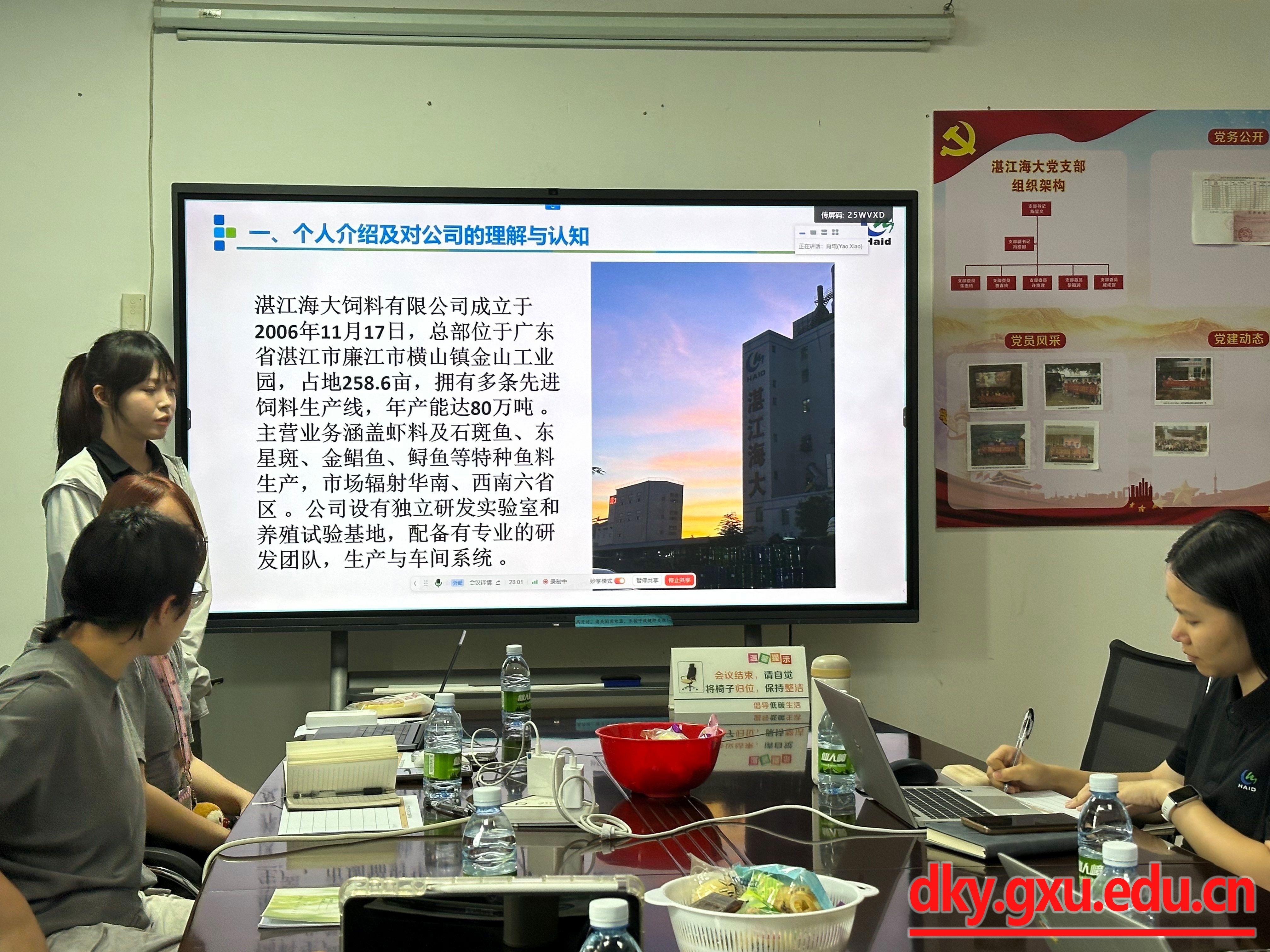 8月26日,实习总结会在湛江海大饲料有限公司总部顺利召开。会议采用线上线下相结合的方式,湛江海大饲料有限公司相关负责人、指导老师以及全体实习学生参加了此次会议。会上,各基地实习学生依次汇报了实习内容、收获与感悟。总部学生详细阐述了品控流程和小水体养殖循环系统的运行与优化;钦州基地学生分享了小棚虾养殖的日常管理与病害防控经验;阳西基地学生则重点介绍了研发实验中的养殖实践操作和数据分析。