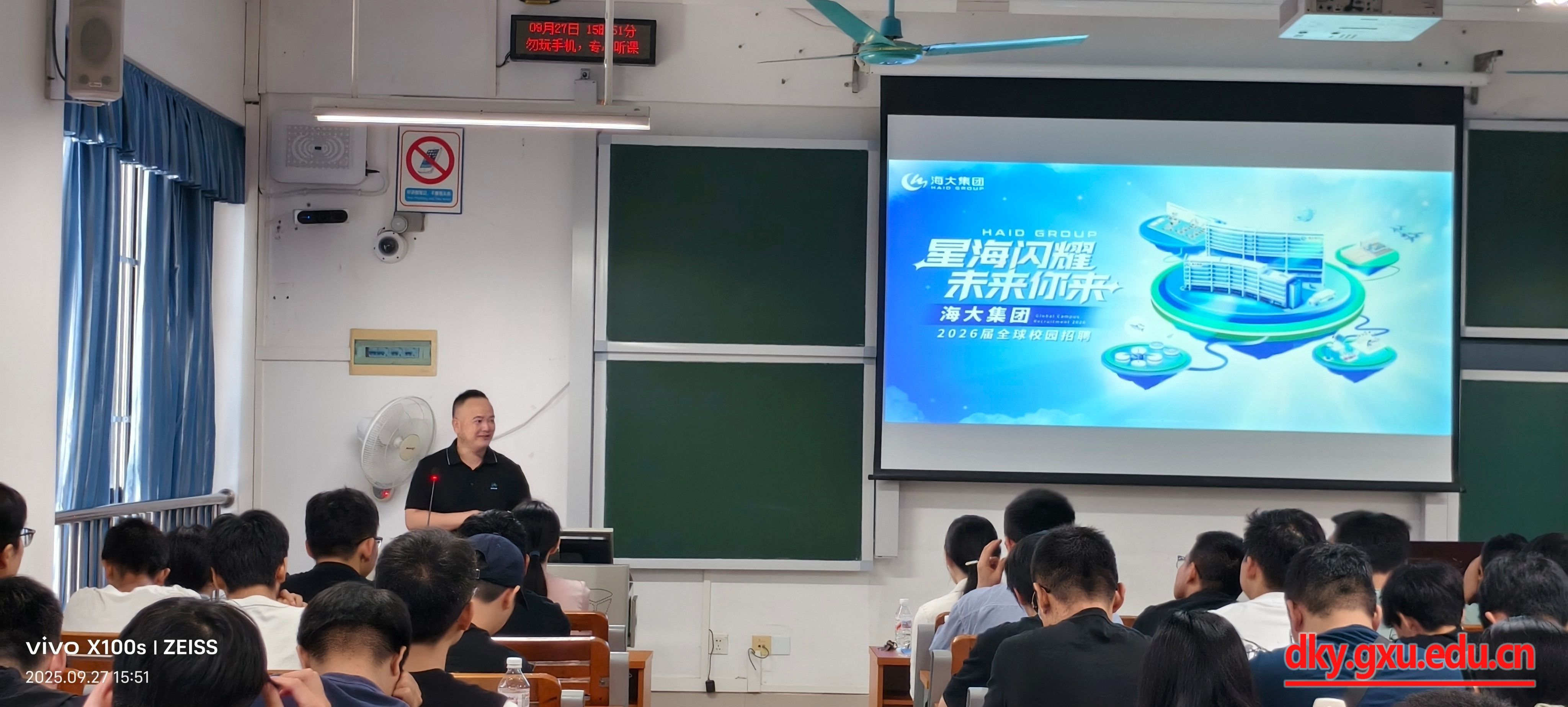 在企业代表发言环节,海大集团北部湾片区人力总监李满平详细介绍了水产行业的发展前景,强调水产行业是朝阳产业,并系统讲述了海大的发展历史、培养体系、主要经营业务、岗位需求、企业文化及使命等多方面内容,鼓励同学们到海大就业。湛江海大技术服务高级工程师于杰表示,自己作为太阳成集团tyc122cc水产研究生,非常感谢太阳成集团tyc122cc水产学科的培养,并分享了自己入职海大的心得体会和取得的成绩,鼓励同学们加入海大,投身水产行业。