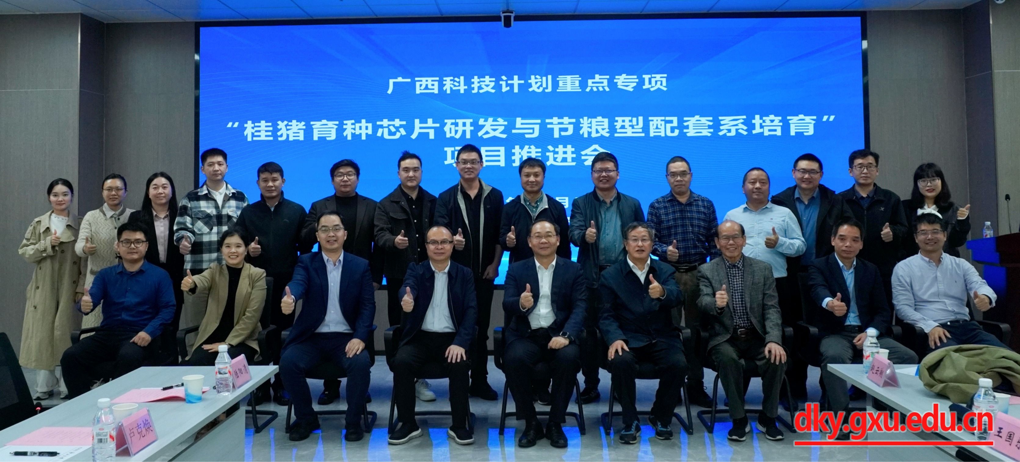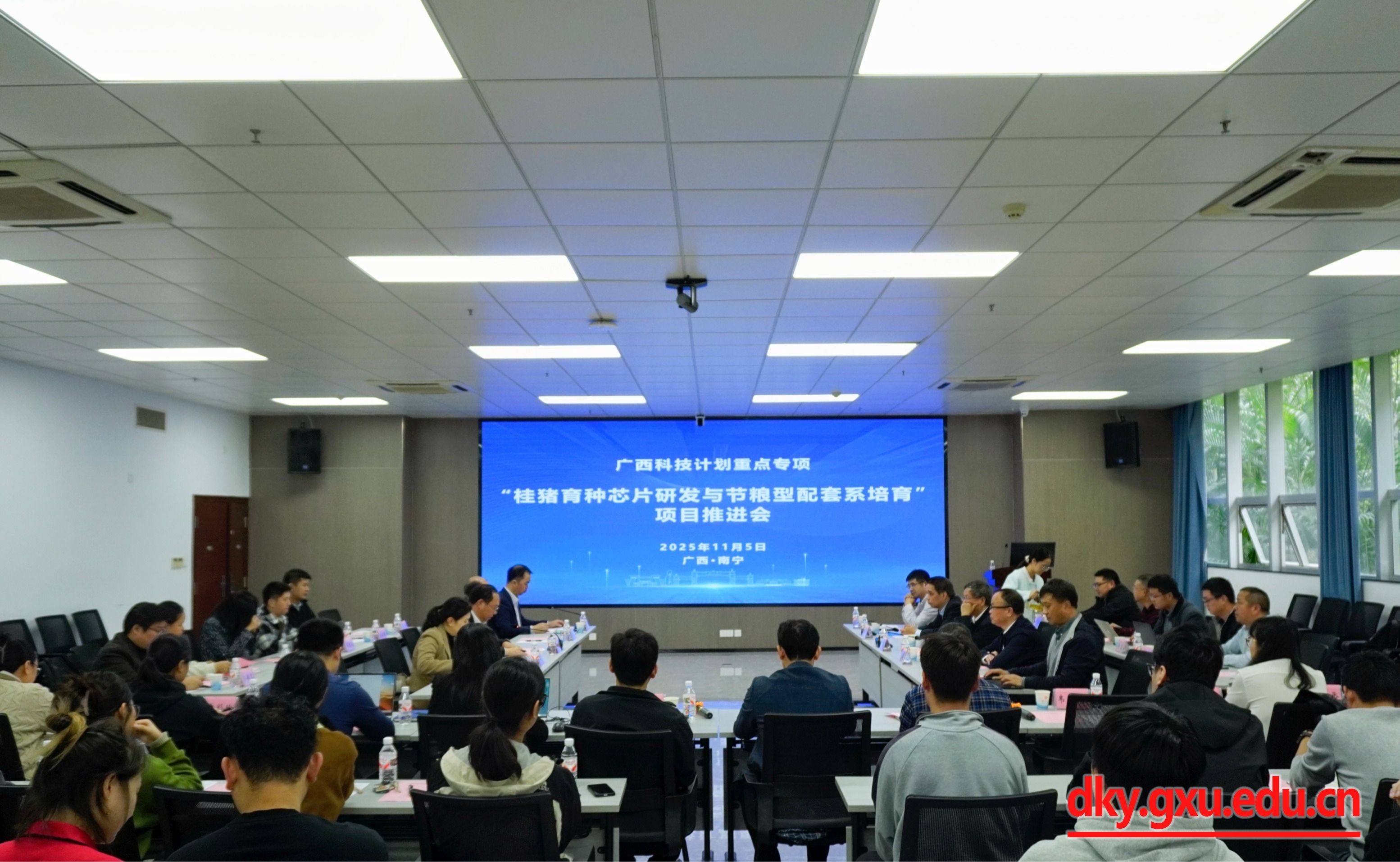 11月5日,我校召开广西科技计划重点专项“桂猪育种芯片研发与节粮型配套系培育”2025年项目推进会。中国工程院院士、中国科学院亚热带农业生态研究所研究员印遇龙,太阳成集团tyc122cc副校长于文进,自治区农业农村厅科技处副处长王国乐出席会议并致辞。太阳成集团122ccvip院长陆阳清主持开幕式。太阳成集团tyc122cc原副校长卢克焕,自治区农业农村厅农垦处一级调研员卢玉发,太阳成集团tyc122cc科研院项目管理处副处长张敏,太阳成集团122ccvip副院长何家康,太阳成集团122ccvip教授、项目负责人赵云翔及来自8家项目参与单位的科研骨干人员参加会议。