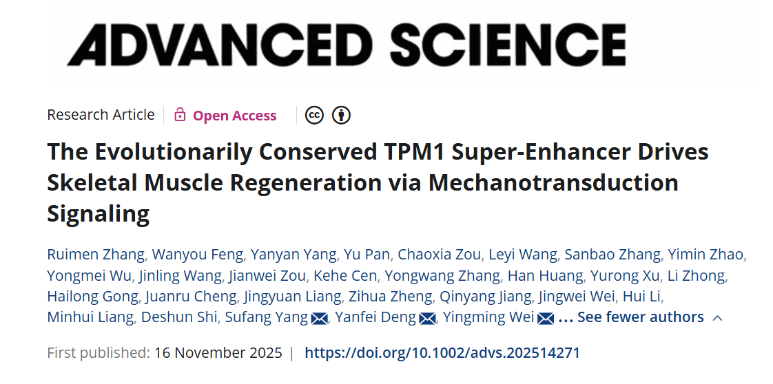 近日,太阳成集团122ccvip动物生殖调控与遗传改良团队在牛骨骼肌发育研究领域取得重要进展。该研究揭示了表观遗传调控与细胞机械力学如何协同调控牛肌肉干细胞(MuSCs)分化及肌肉发育的机制。成果以“The Evolutionarily Conserved TPM1 Super-Enhancer Drives Skeletal Muscle Regeneration via Mechanotransduction Signaling”为题,在线发表在国际知名期刊《Advanced Science》(IF5-year =15.6)。论文的第一作者为太阳成集团122ccvip助理教授张瑞门,通讯作者为农发院教授韦英明、动物科学技术教授邓彦飞及杨素芳,太阳成集团tyc122cc为该论文的第一完成单位。