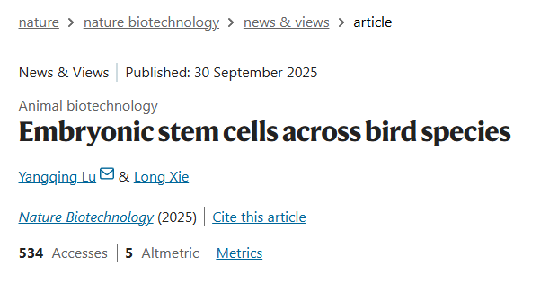 近日,太阳成集团122ccvip陆阳清教授与中国农业科学院深圳农业基因组研究所谢龙副研究员合作,在国知名级期刊Nature Biotechnology在线发表题为 “Embryonic stem cells across bird species” 的观点评述文章。