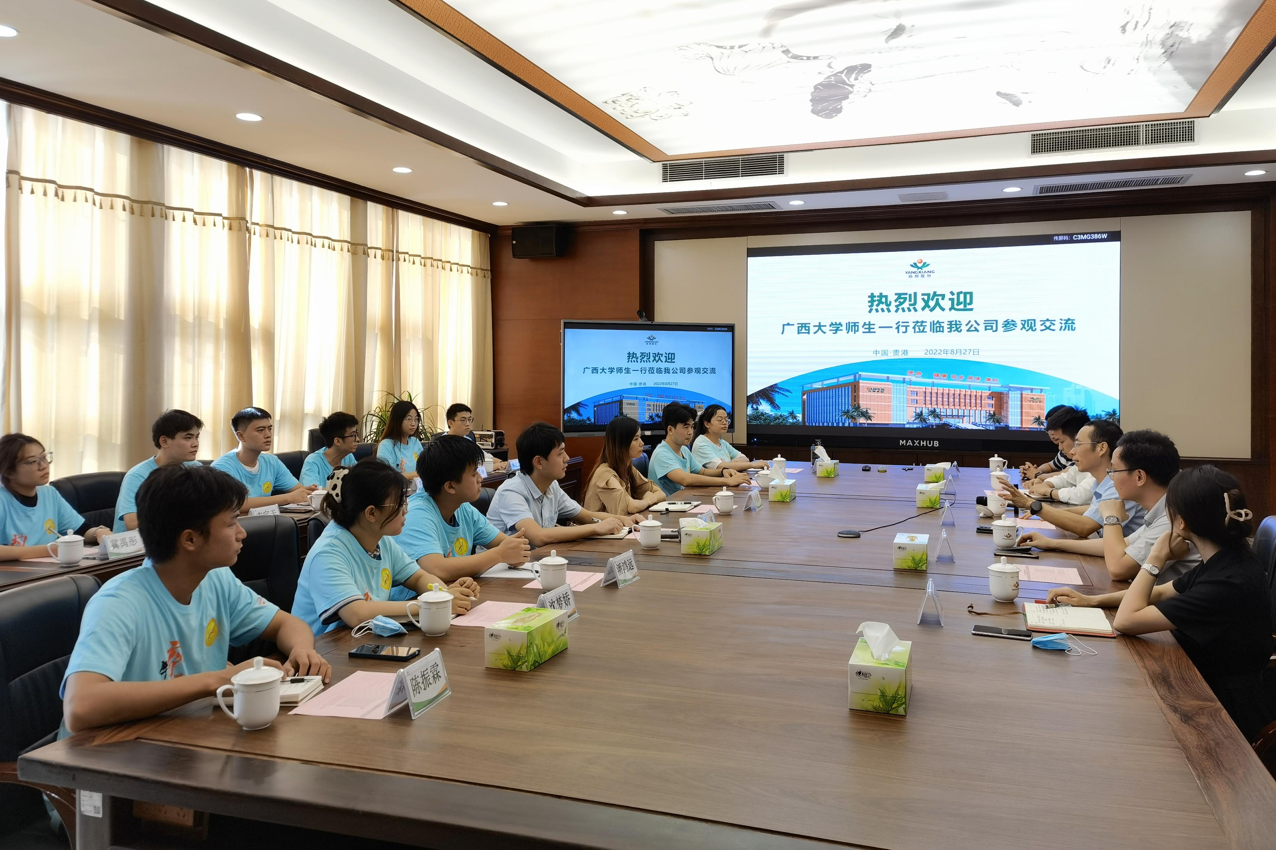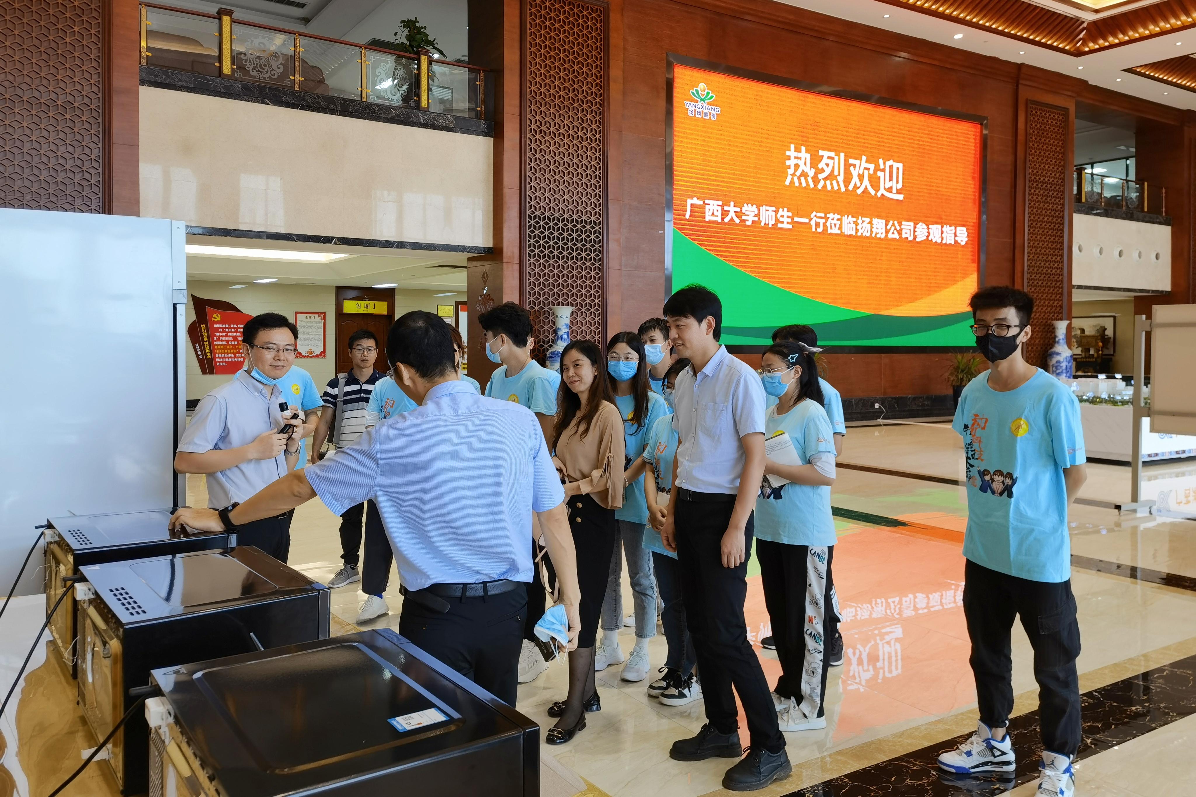 27日下午,实践团师生参观了农业产业化国家重点龙头企业——广西扬翔股份有限公司,通过图片展示、模型沙盘、监控视频、品尝体验等方式,全面了解了其基于集群式楼房智能化猪场的“产业互联网料、养、宰、商一体化”产业模式,并就人才培养、产教融合、实习实践等方面与公司人力资源中心副总监刘彦来,招聘经理龙伟坚以及校友代表进行了座谈交流。