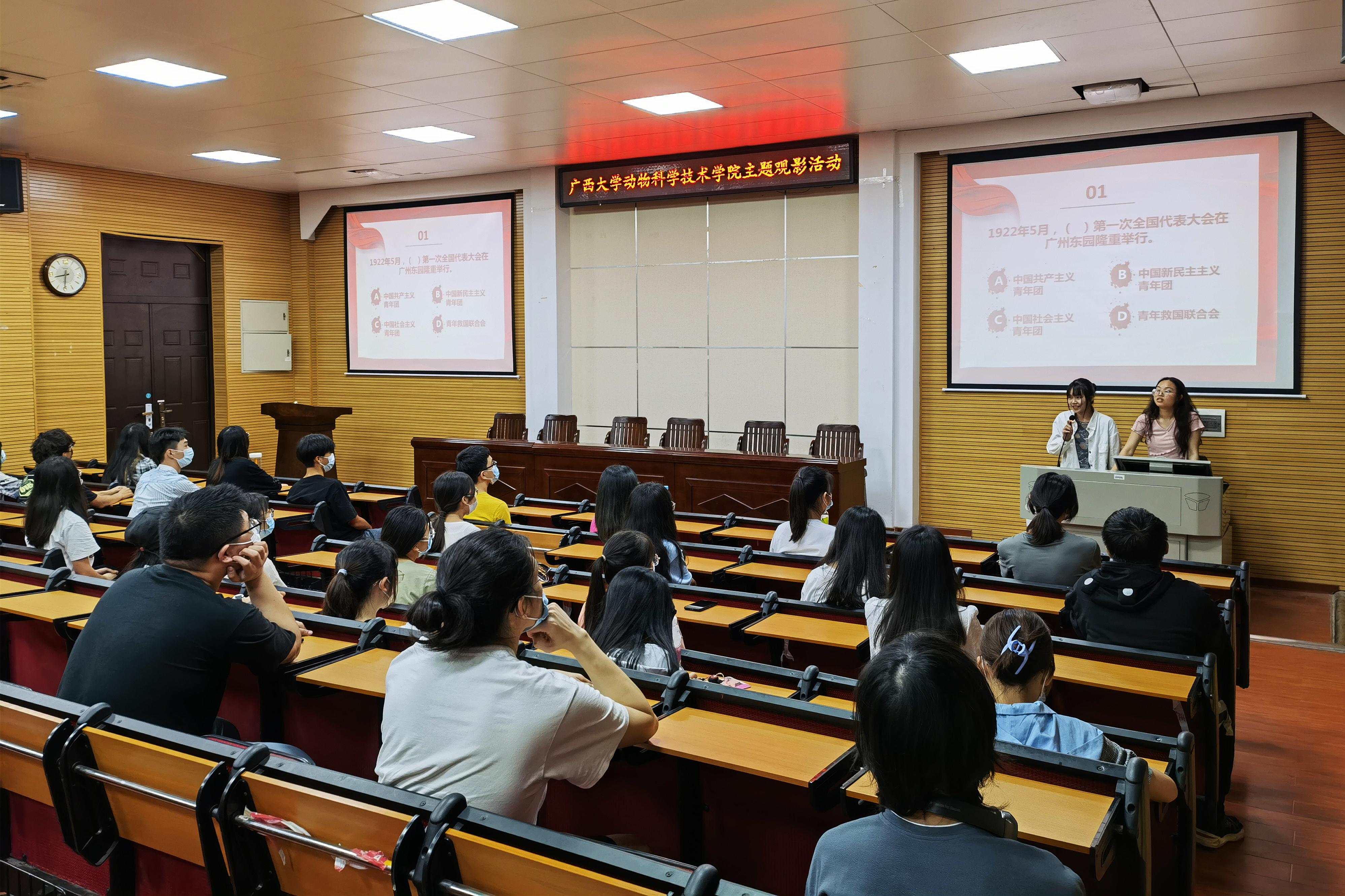 观影过程中,同学们穿插进行了三轮知识竞答,题目紧紧围绕党领导中国青年运动的光辉历程,涉及政治、经济、文化、军事、科技等各个领域,包括选择、音乐两种题型。大家精神饱满、踊跃作答,现场气氛紧张而热烈。