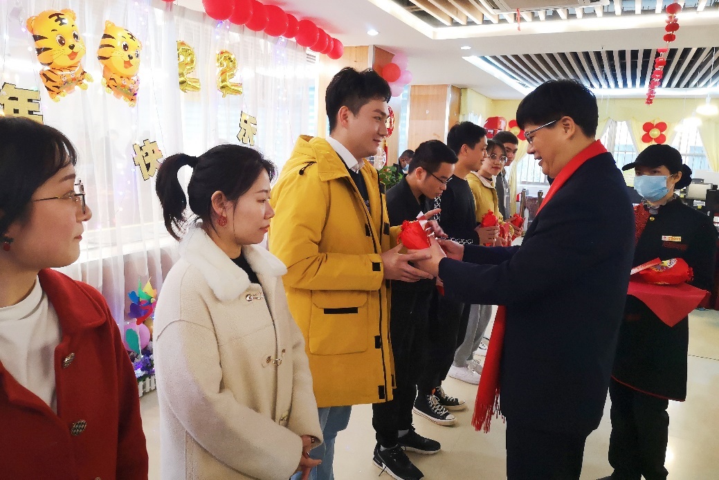 罗廷荣副校长代表学校向留校过年的同学们致以新春的问候,表达了殷切希望和美好祝福。他给大家送上“红包”和“福袋”,并为近两天过生日的2名同学庆生,与大家同唱生日歌、同切生日蛋糕,在一片欢声笑语和祝福声中将年夜饭推向高潮。