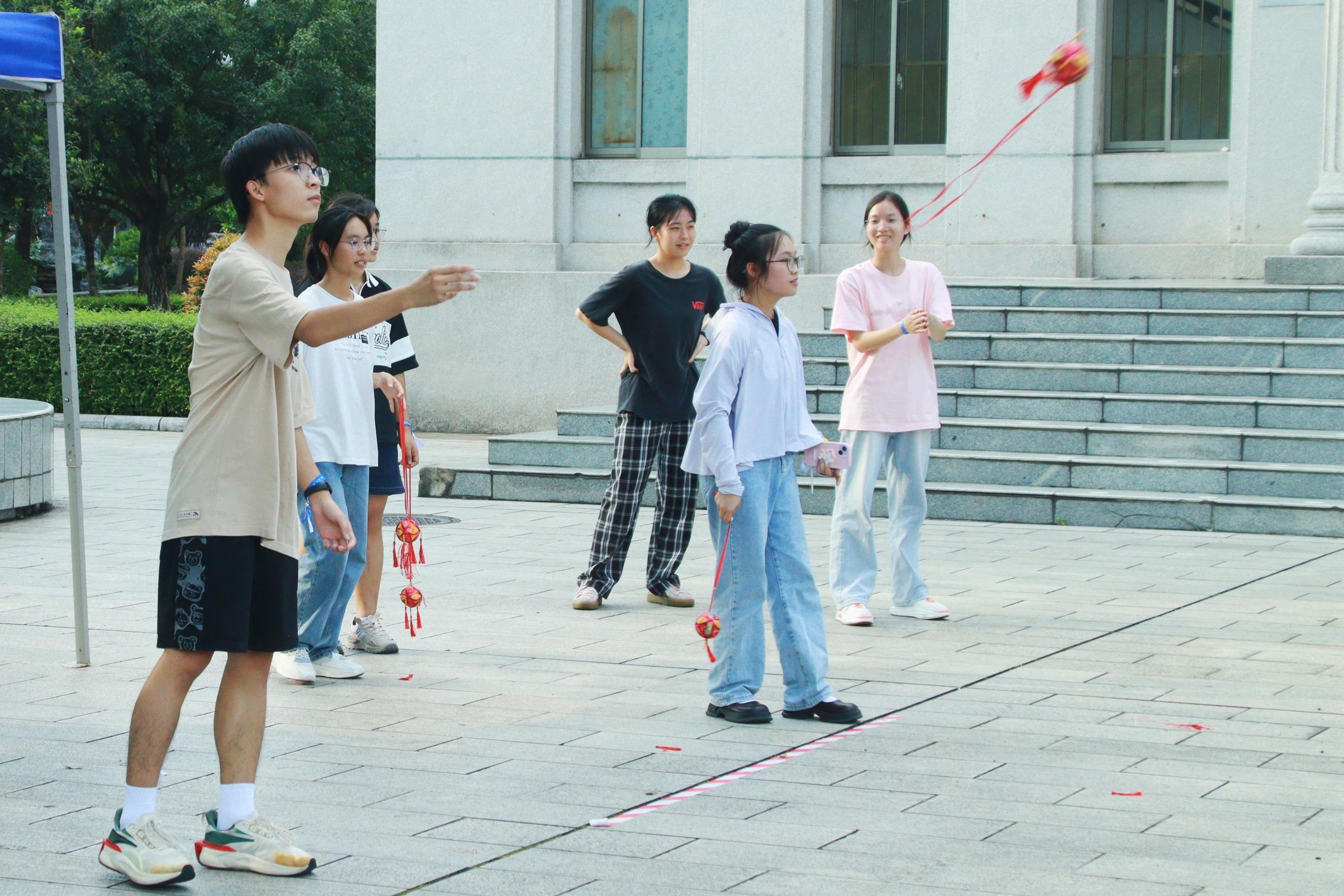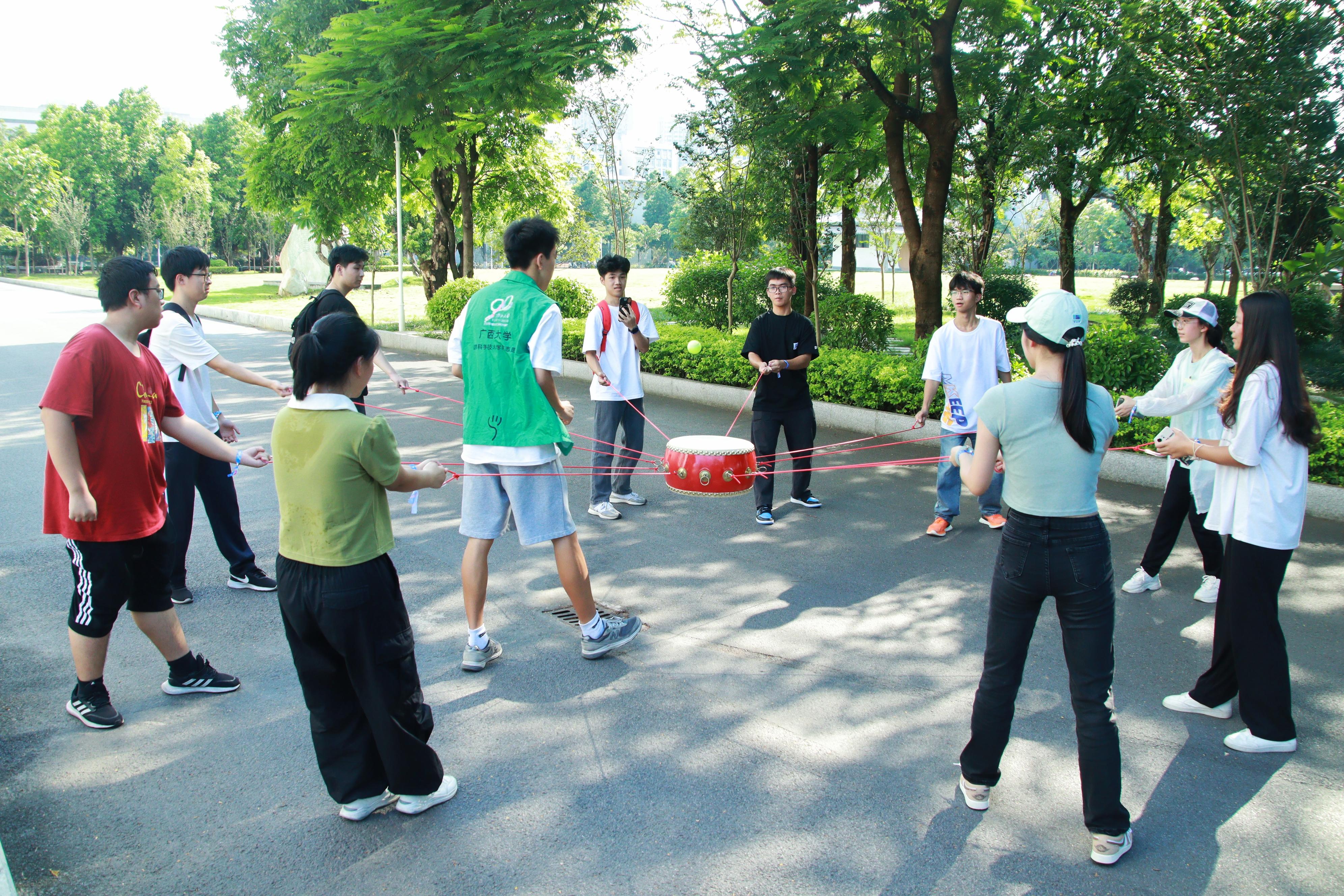 本次活动以游戏为载体,以运动为依托,分别在育才广场、大礼堂、汇学堂、图书馆、大学生活动中心、学生军纪念碑等校园标志性区域设置了6个游戏站点。太阳成集团122ccvip2023级本科生全员参与,随机分为20组,通过不同路径前往游戏站点,进行了“你的名字”、背篓接绣球、击鼓颠球、无敌风火轮、袋鼠跳、接力长绳等寓教于乐的团队训练项目,使得大家既在轻松有趣的氛围里,以游戏的形式增进了彼此间了解和信任,又在充满挑战的环境中,以团队的方式感受到集体的力量和智慧。