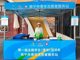 除了赛会志愿者,城市志愿者的服务同样热情温馨。“我是一名党员,我更应该有无私奉献的精神。我愿意为广西,为我美丽的家乡,为第一届全国学生(青年)运动会尽自身全力。”这是2021级动物医学专业学生黎芮伶的有感而发。免费手机充电、城市道路指引、学青会信息咨询、导游导购、义务宣传、应急药箱……一间小小的南宁市青年志愿者服务站承载着多重功能。动科学院3名“小青芒”作为城市志愿者,为这场青春盛会贡献自己的一份青春力量。
