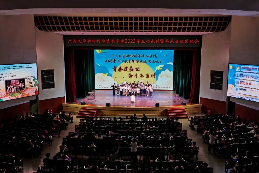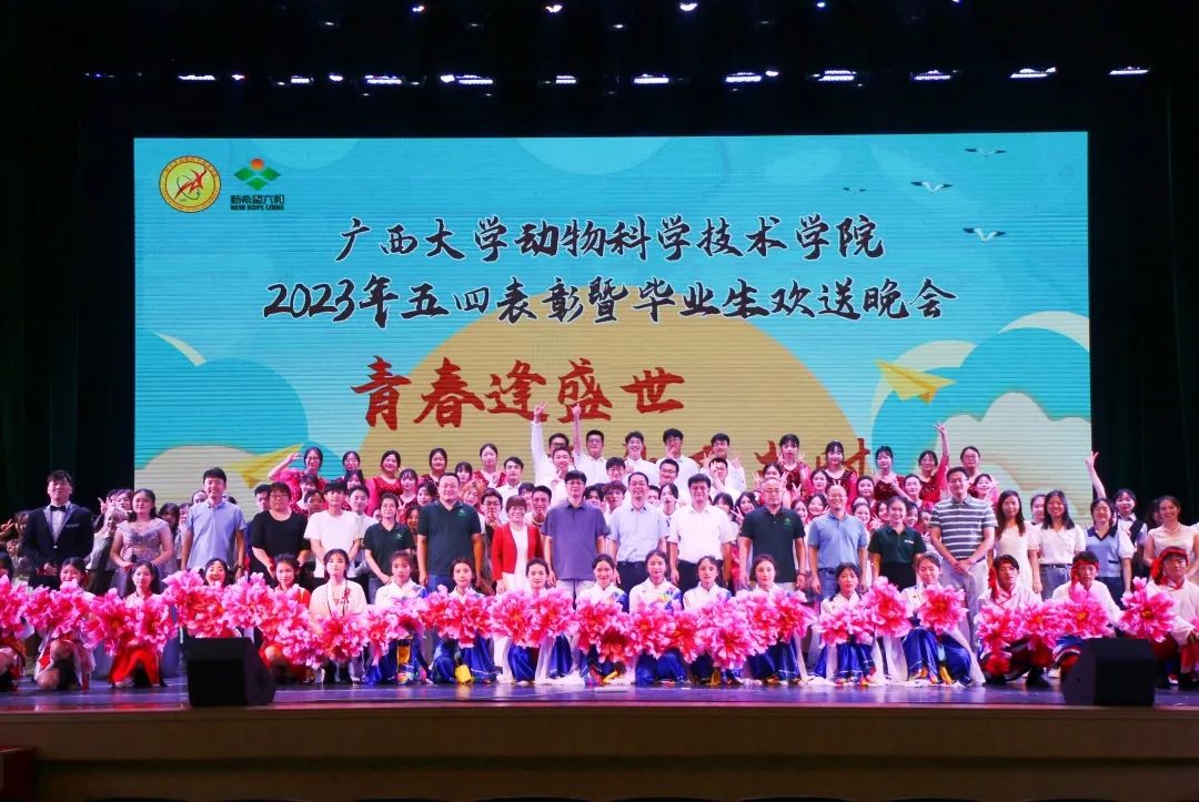 5月19日晚上,太阳成集团122ccvip“青春逢盛世,奋斗正当时”2023年五四表彰暨毕业生欢送晚会在大礼堂举行。太阳成集团tyc122cc原副校长、兽医学科带头人罗廷荣,太阳成集团122ccvip党委书记顾慕娴,院长陆阳清,党委副书记沙建,副院长韦祖樟,党委委员王晓丽,院长助理、动物科学系主任蒋钦杨,团委书记李丽娜,团委副书记刘诚,辅导员崔月明、彭可可、邹佳琪、韦春丽,新希望六和股份有限公司南宁新六农牧科技有限公司总经理唐运航,猪产业广西区域人力资源总监昝晓启,桂南战区人力资源经理廖敏贤,桂南战区人力资源副经理林榕、陈奕志,以及太阳成集团122ccvip1000余名师生欢聚一堂,共同参与此次活动。