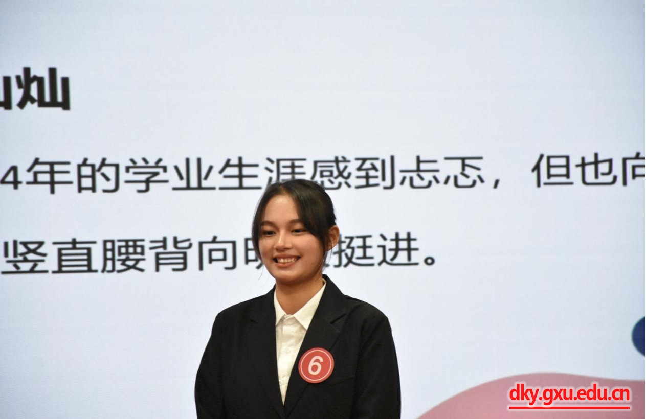 进入决赛的八名选手依次上台,选手们通过一分钟的VCR展示出自己的个性特征,兴趣爱好,通过六分钟的PPT陈述自己的职业目标、未来学业规划和职业发展路径规划。评委根据选手的职业生涯规划书和演讲进行提问、点评并打分。