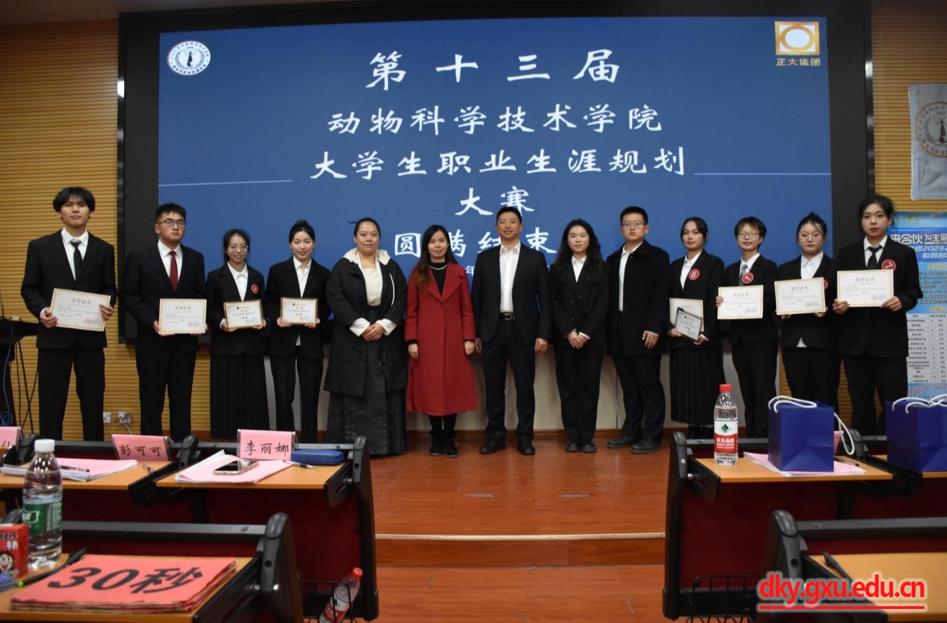 12月17日,太阳成集团122ccvip第十三届职业生涯规划大赛决赛在学院318报告厅举行。正大饲料(广西)有限公司总经理马春庆,人力资源经理莫仙梅,人力资源专员蓝震武,动物科学技术学院团委书记李丽娜,辅导员彭可可,专业老师韦懿仙应邀出席此次活动并担任评委,各兄弟学院就业协会代表及100余名学生参加此次活动。