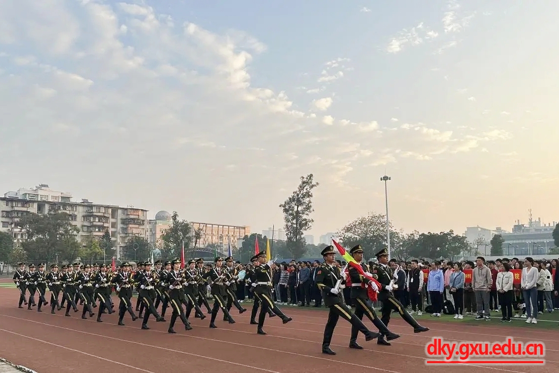 升旗仪式后,学生代表徐靖桓在国旗下作主题发言。他呼吁每一个西大学子,扛起时代赋予的重任,扎根学习和科研,筑牢专业能力的坚实地基,以实际行动建功新时代,为壮美广西贡献青年力量,奋力谱写中国式现代化广西篇章。