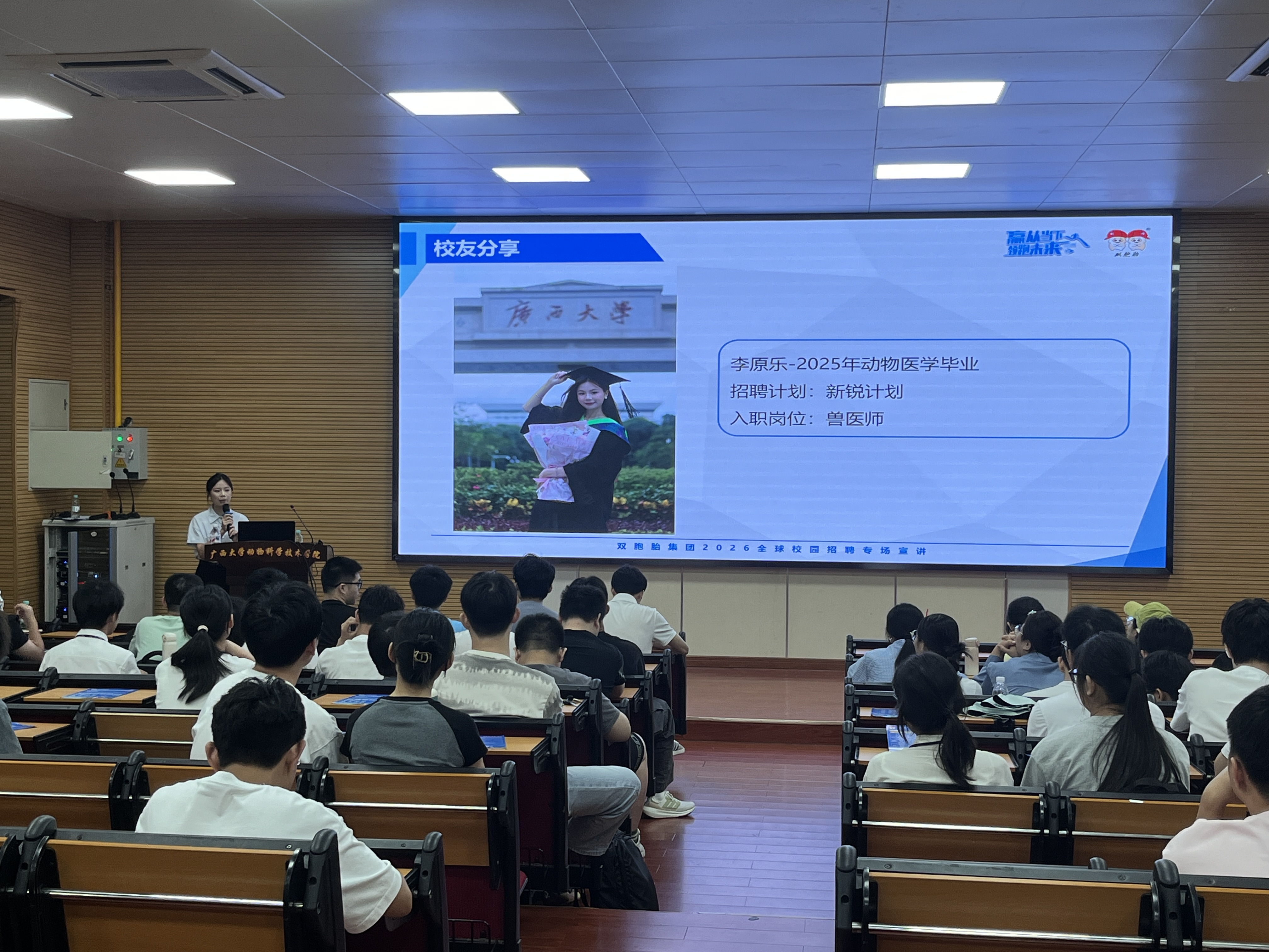 学院就业指导老师简要介绍了当前动科专业就业市场态势,强调了优秀校友经验对求职的指导价值。随后,3位校友结合自身从校园到职场的成长经历,用接地气的分享风格、鲜活的实战案例,为学弟学妹们全景呈现不同就业路径的发展图景。