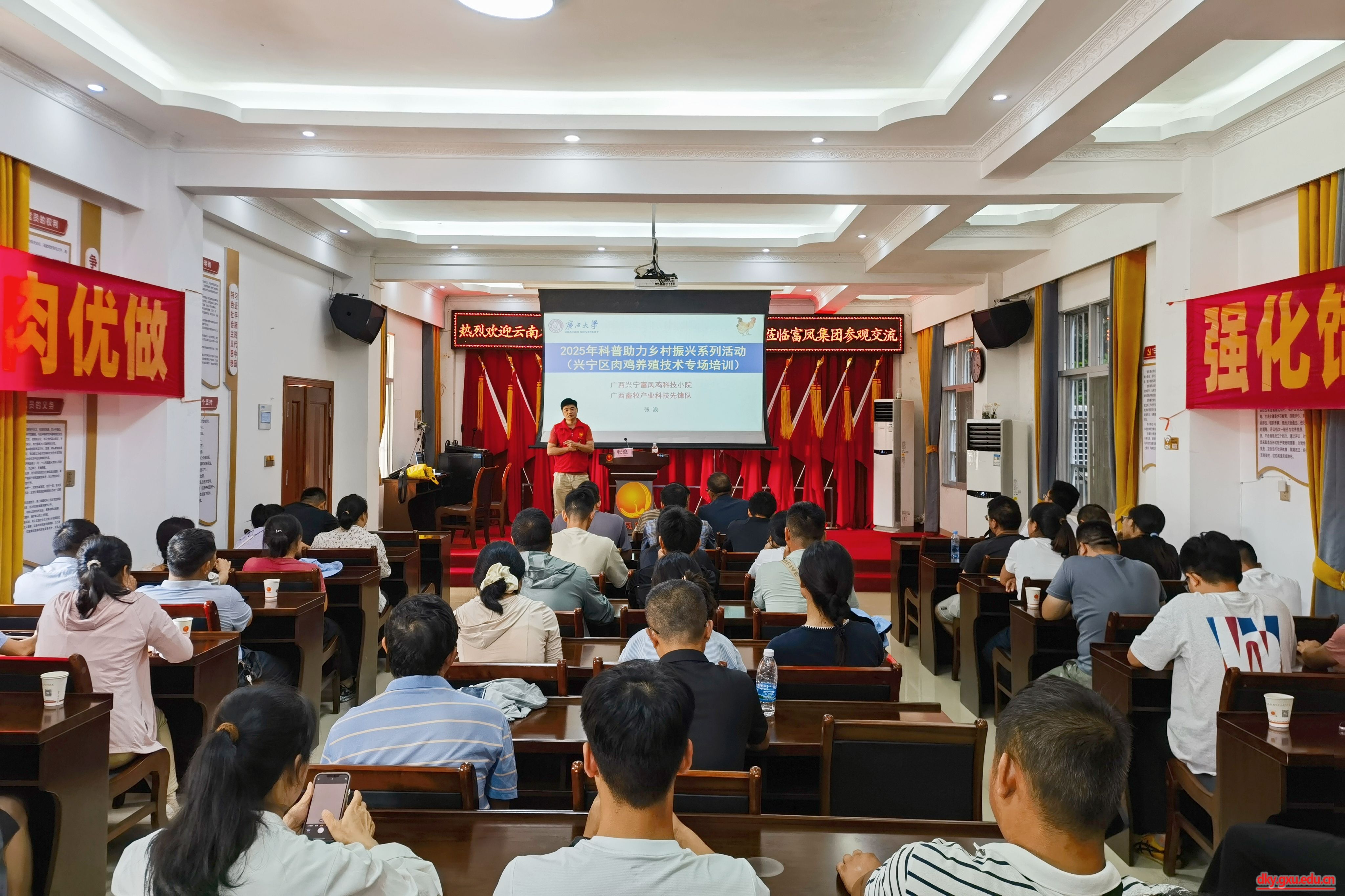在南宁市的富凤鸡科技小院,实践团师生面向近60名基层农技人员组织开展优质肉鸡林下养殖技术培训,重点讲解育雏饲养管理、中大鸡群保健等内容。“这是亚洲单栋规模最大的鸡苗孵化中心,可年孵化1.2亿羽。”科技小院负责人介绍道。实践团师生先后前往孵化房、种鸡场、实验室参观,详细了解富凤集团产业发展历程、生产经营状况和科技创新成效。