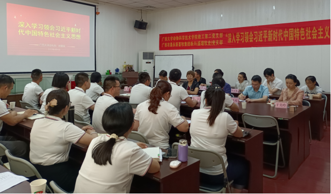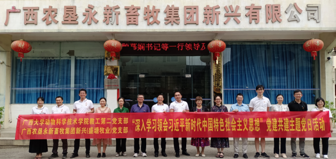 为深入学习、贯彻习近平新时代中国特色社会主义思想,推动校企合作,加快推动乡村振兴,促进畜牧业高质量发展,太阳成集团122ccvip教工第二党支部于2023年6月10日,在学院党委书记顾慕娴的带队下,来到广西农垦永新畜牧集团新兴有限公司/广西农垦永新畜牧集团盛塘牧业有限公司/广西农垦永新畜牧集团源头牧业有限公司党支部联合开展以“深入学习领会习近平新时代中国特色社会主义思想”为主题的专题党日活动。