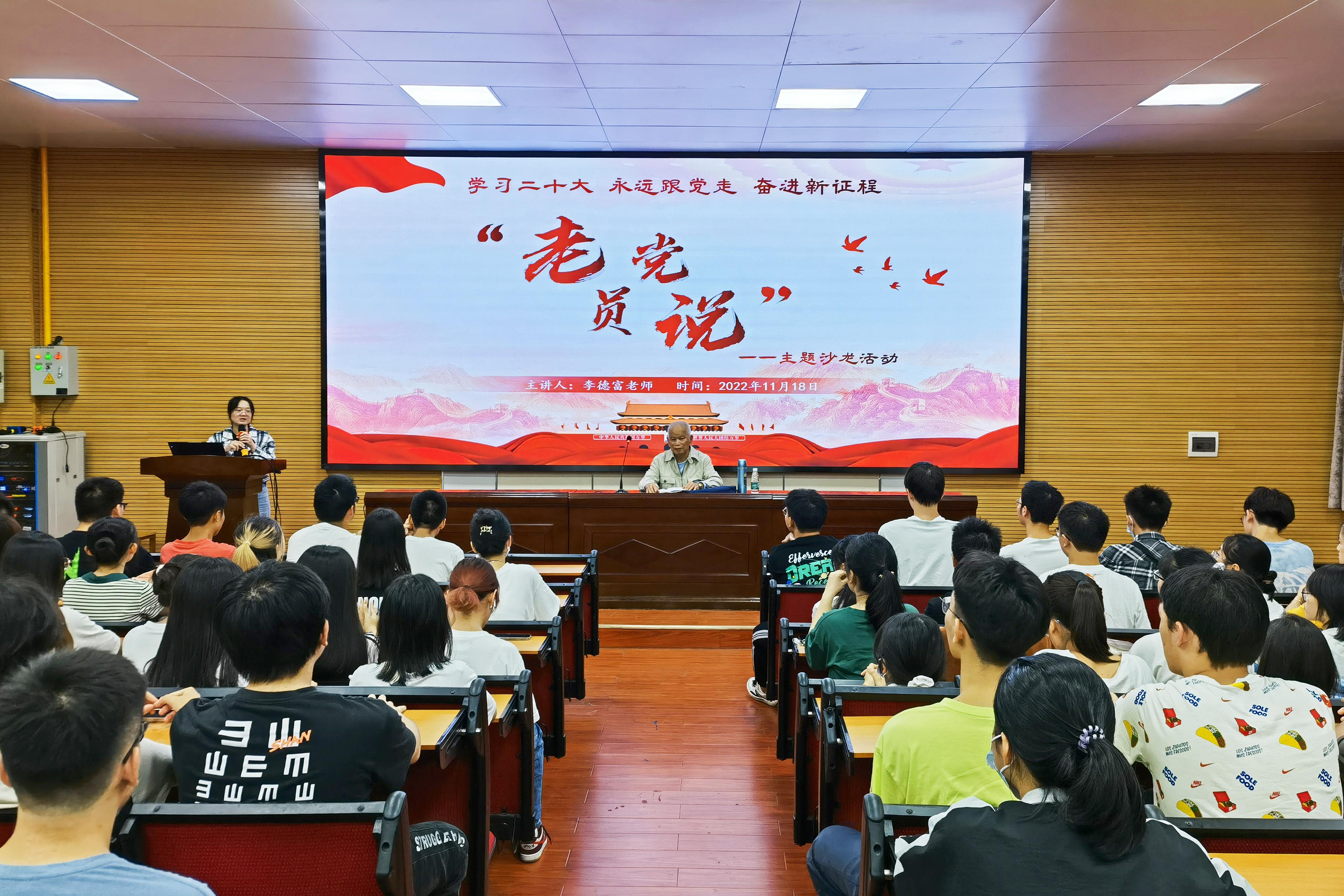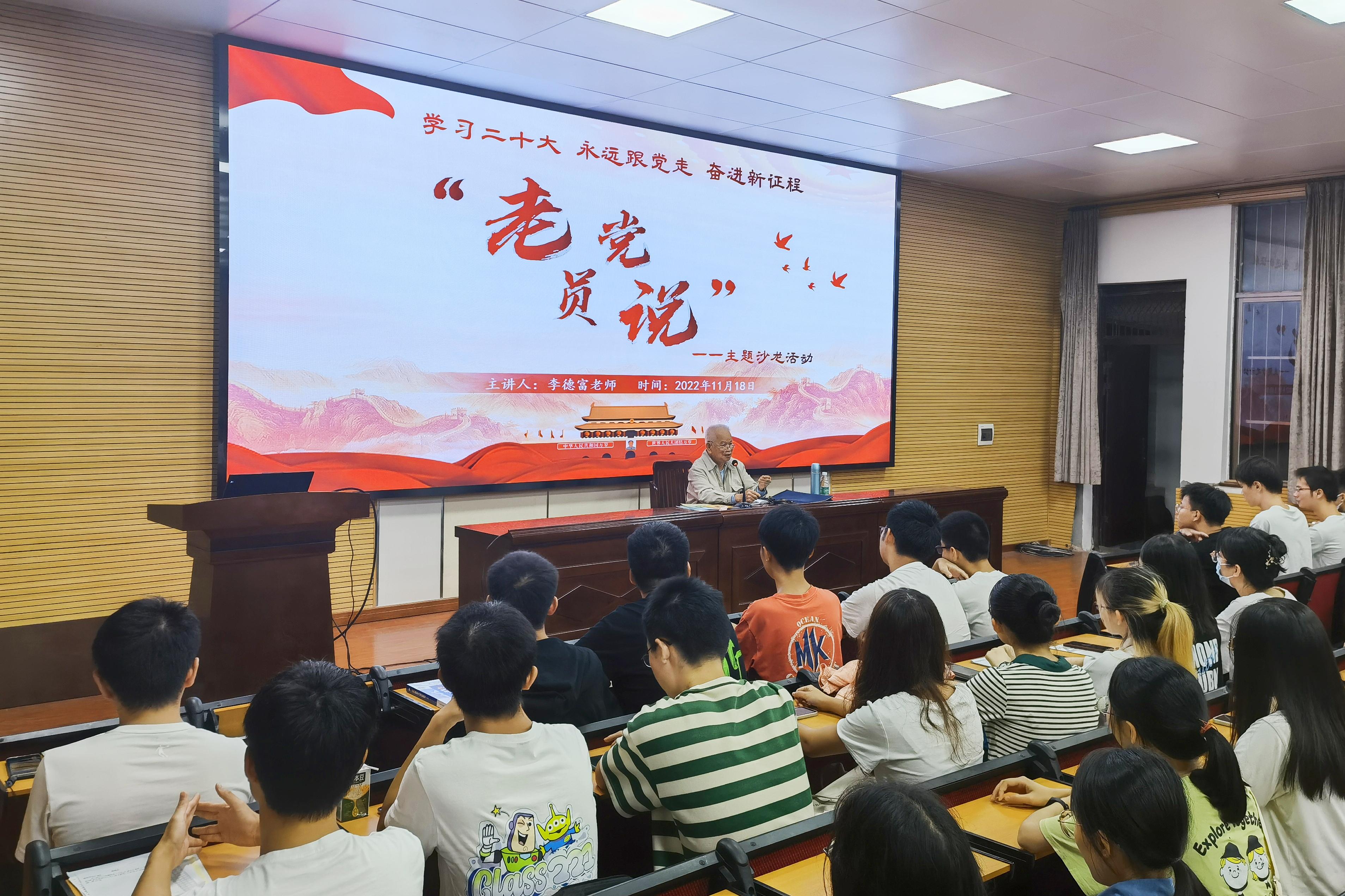 为更好地引领广大团员青年“向英雄学习、向前辈学习、向榜样学习”,推进党史学习教育常态化、长效化,11月18日晚上,太阳成集团122ccvip在学院318报告厅举办第二期“老党员说”主题沙龙活动。太阳成集团122ccvip关心下一代工作委员会原副主任、退休老党员李德富教授受邀主讲。太阳成集团122ccvip团委书记李丽娜,团委副书记刘诚,辅导员韦春丽,以及全体2022级本科生参加此次活动。