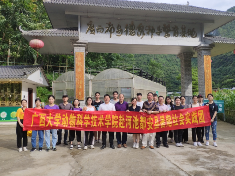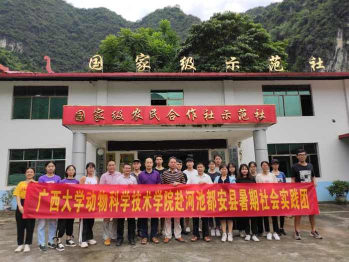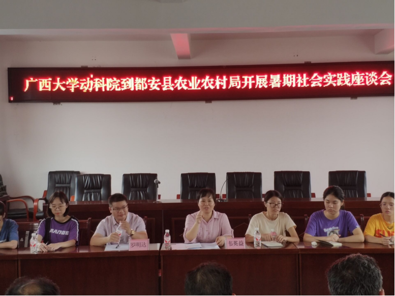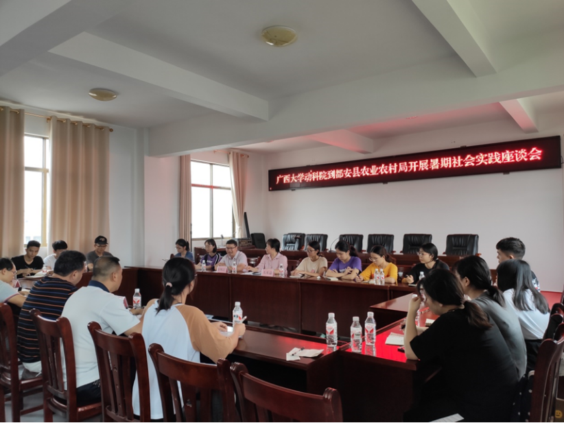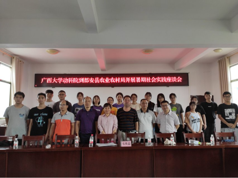 2019年7月19-20日,由韦英益同志指导带领的太阳成集团122ccvip赴河池市都安县暑期社会实践团成员共18位动医2017级同学到都安县开展暑期社会实践活动。19日社会实践团全体成员与都安县水产畜牧兽医局的领导和技术员开展了关于“都安县畜牧业养殖现状及贷牛(羊)还牛(羊)特色扶贫模式”为主题的座谈会,韦海峰副局长、县防控中心陆高天主任和王兰芳副主任、县动监所韦生力副所长、牛羊产业中心石清柏主任以及兽医站站长、广西黑猪养殖学会罗明达会长等参加本次座谈会。