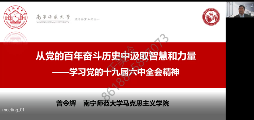 南宁师范大学马克思主义学院院长、自治区党史学习教育宣讲团成员曾令辉教授通过线上讲授了题为“从党的百年奋斗历史中汲取继续前行的智慧和力量——学习党的十九届六中全会和《决议》精神”的党课,曾教授形象生动地从党的百年奋斗历程谈起,详细分析了目前国内外的形势,将党的百年奋斗重大成就和历史经验高度浓缩为“一个主题”、“四个关键词”“两个确立”,总结了党的十九届六中全会和《决议》精神,不时激励与会党员教师及同学们积极进取,铸牢专业知识和技能,发挥畜牧兽医专业优势,服务三农和乡村振兴。学院各党支部共计400多位党员参加本次线上专题培训。