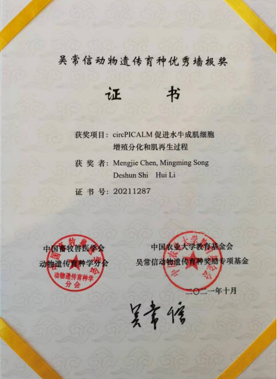 第二十一次全国动物遗传育种学术讨论会是我国动物遗传育种领域进行学术交流的一个优秀平台。本次学术会以“良种传天下,科技创未来为”主题,汇集了猪遗传育种、家禽遗传育种、草食动物遗传育种、统计基因组与生物信息、功能基因组与生物技术以及统计与功能基因组等方向的最新科研成果。会议交流内容包括特邀报告、口头报告以及墙报,其中我院博士研究生陈孟杰(导师:石德顺、李辉)荣获本届会议的吴常信动物遗传育种优秀墙报奖。参加本次学术讨论会的师生不仅了解到动物遗传育种学领域的最新科研成果、研究动态与趋势,而且还有助于梳理和扩展研究思路,更好地规划未来的研究方向。