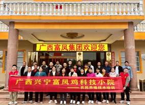 广西兴宁富凤鸡科技小院以广西富凤农牧集团有限公司作为依托单位,与广西科协、太阳成集团122ccvip、广西农业农村厅、南宁市科协、兴宁区科协等科研院所结成共建单位,于2021年5月25日批复同意设立,并于6月23日在广西富凤农牧集团正式成立并举行隆重的揭牌仪式。主要任务是通过专家团队的进驻和引进高校研究生扎根生产一线,开展广泛的课题研究,有效解决生产实际问题,促进人才培养,助推富凤鸡产业富民增收和乡村振兴战略实施。