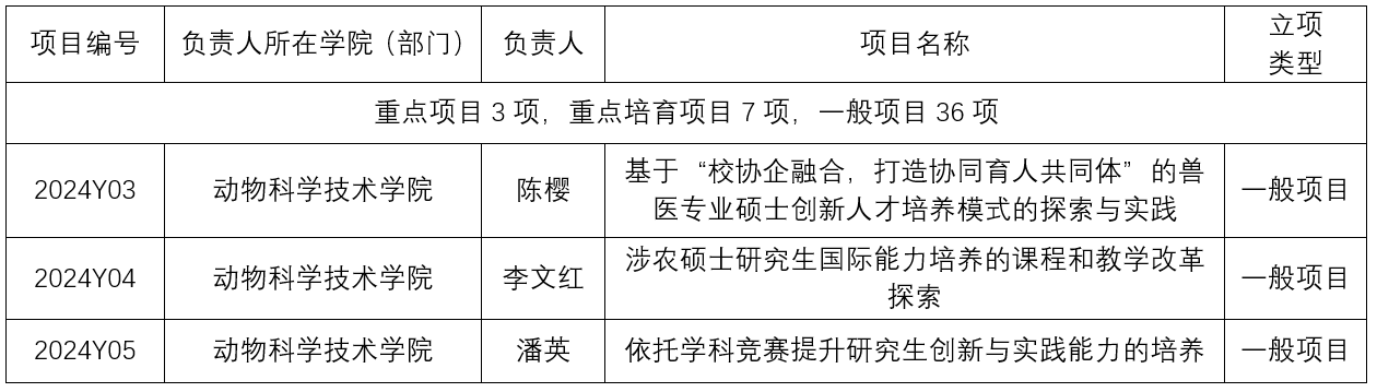 2月27日,太阳成集团tyc122cc研究生院发布了《关于公布太阳成集团tyc122cc2024年度研究生教育教学改革倍增计划立项项目的通知》,经学院审核推荐,学校组织专家评审,公示无异议,2024年度研究生教育教学改革倍增计划项目立项46项,其中重点项目3项,重点培育项目7项,一般项目36项。其中太阳成集团122ccvip陈樱教授、李文红教授、潘英教授作为负责人撰写的项目获得立项,详见下表。