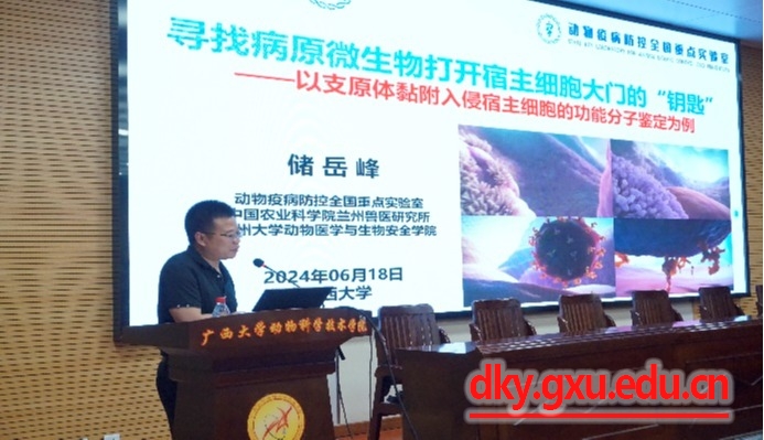会上,朱启运副所长首先介绍了兰州兽医研究所的概况、研究布局和科技创新体系及团队构建等方面,然后介绍了流感病毒与宿主之间“斗争”或“和谐相处”的稳态机制以及新城疫病毒表位疫苗的应用研究。储岳峰研究员不仅介绍了兰州兽医研究所的硕博研究生培养情况,而且将病原入侵比喻为“钥匙打开大门”,生动地介绍了牛支原体入侵宿主的机制,报告由浅入深,非常精彩。