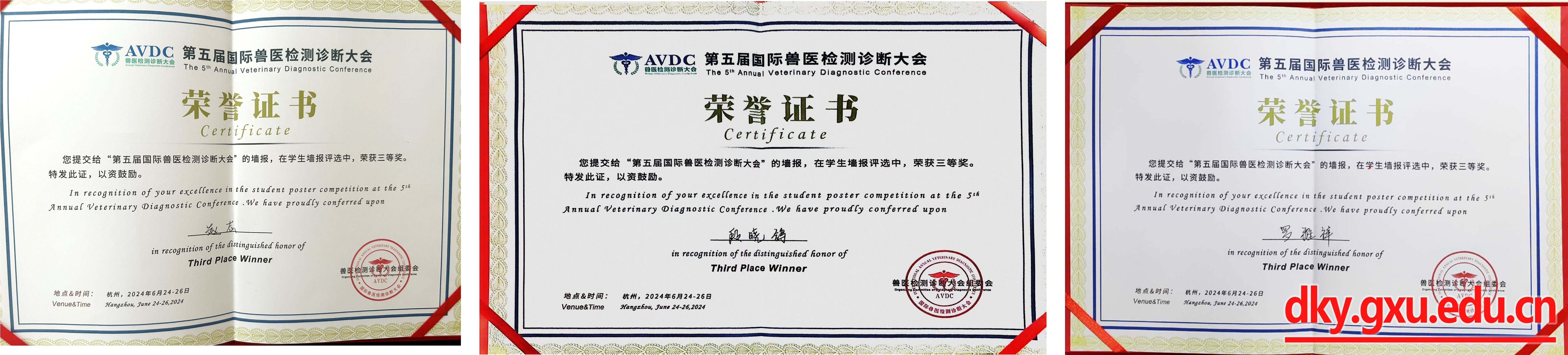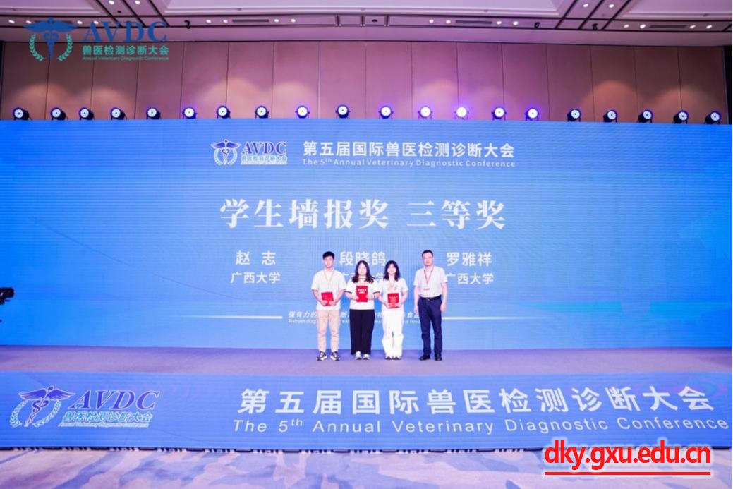 来自中国、美国、英国、荷兰、加拿大、澳大利亚、日本、韩国等国家的120多位嘉宾,为参会代表带来了128场精彩纷呈、内容丰富的主题报告,与广大参会代表分享自己在兽医诊断领域的独到见解和宝贵经验。借此机会,陈海兰教授一行与汇报嘉宾、国际知名专家对兽医检测诊断领域前沿问题进行了积极的交流和探讨,努力推进我校与国内外高校和企业的合作。我院贺兆源等五位研究生所投稿件均被大会录用于大会论文集并以墙报形式向参会同行展示。初步评选后,贺兆源、赵志、段晓鸽和罗雅祥四位同学的墙报进入第二轮现场口头汇报。经过美国堪萨斯洲立大学白建法教授等专家组成的评审委员会从研究深度、应用前景、汇报表现等方面进行综合打分评选后,本次大会所设3个墙报展示三等奖被我院的赵志、段晓鸽和罗雅祥3位研究生包揽,为学院赢得了荣誉和认可。