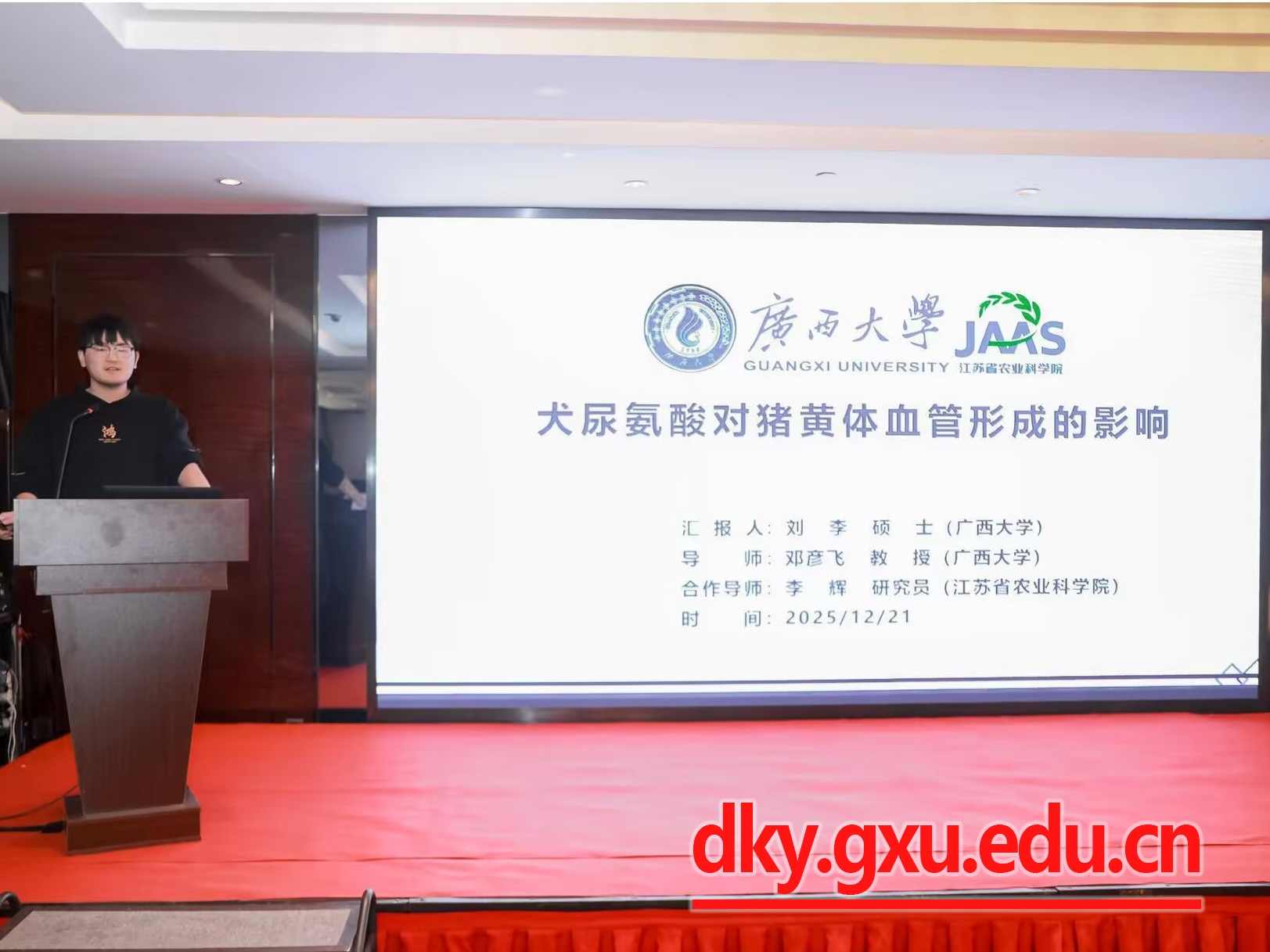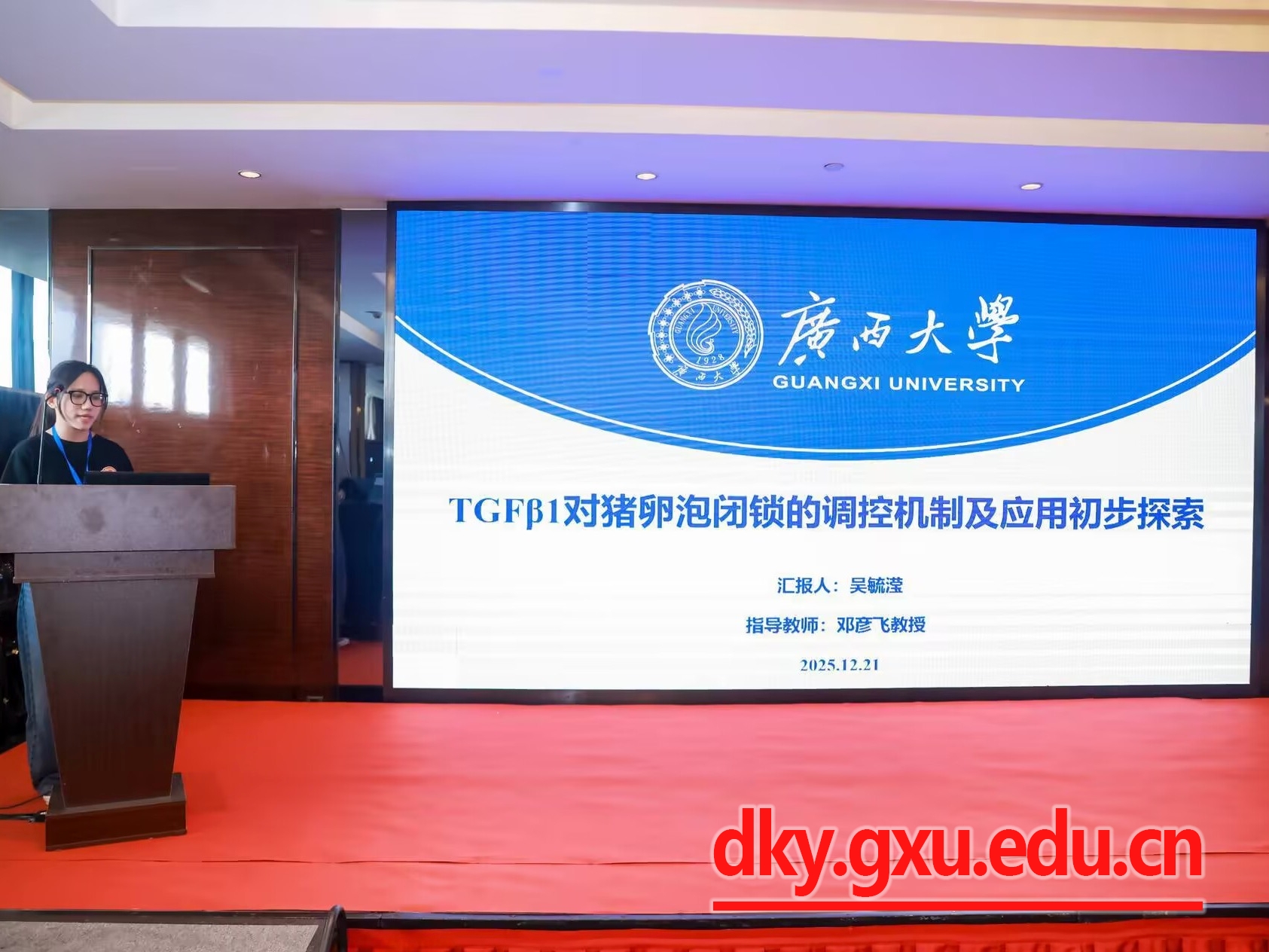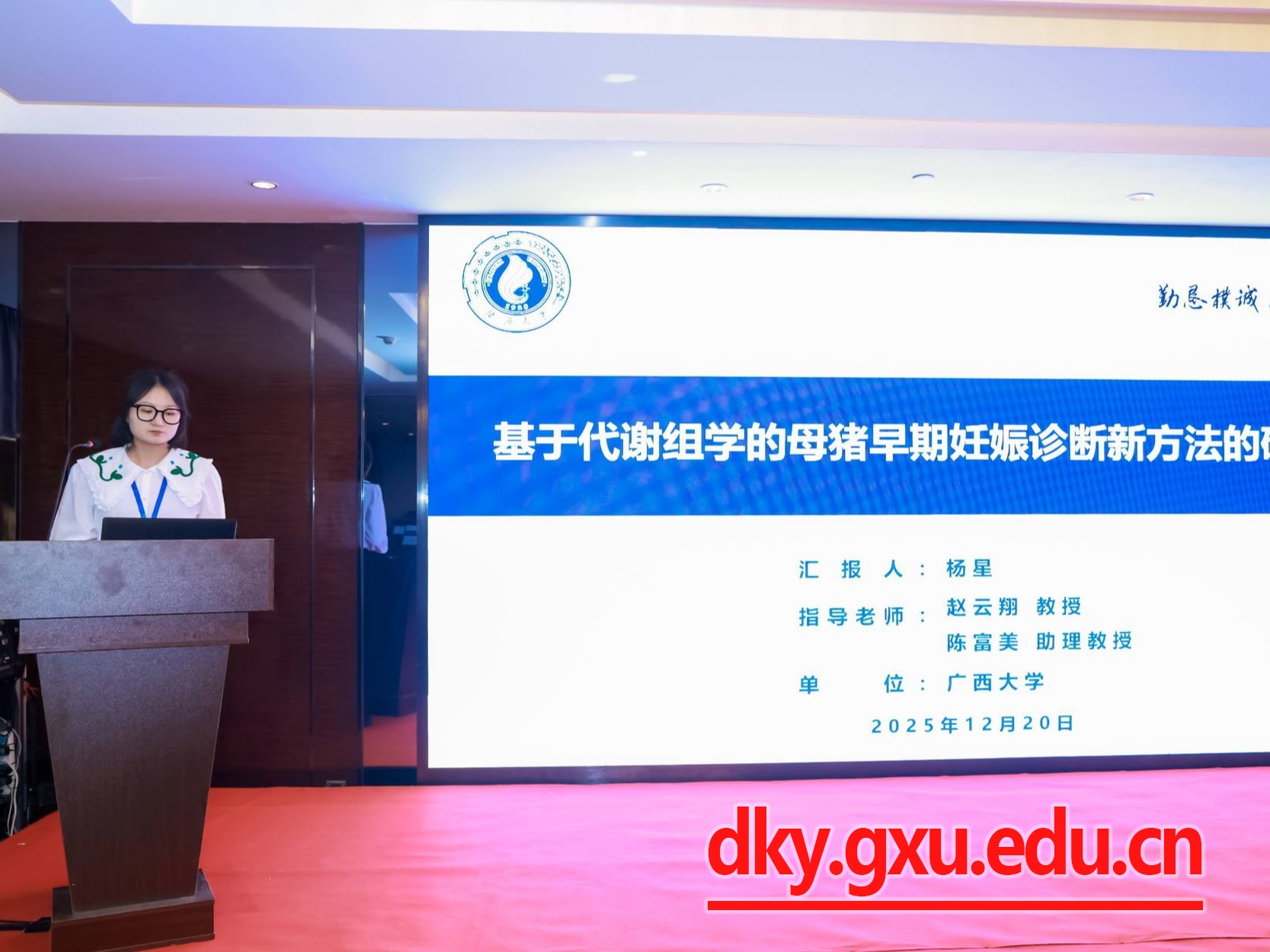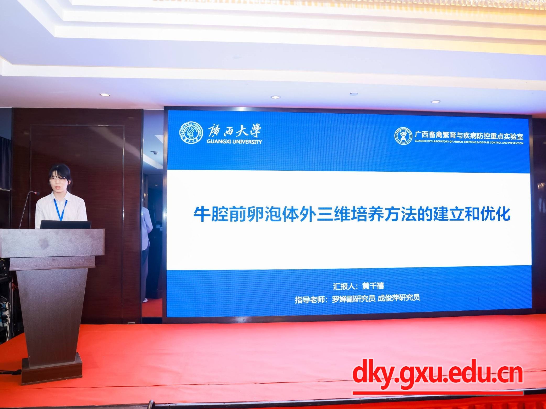 本次研讨会以“促进动物繁殖理论与技术创新,推动产业高质量发展”为主题,汇集了繁殖领域基础研究、前沿技术探索以及产业发展的最新进展和成果。会议交流内容包括特邀报告、青年学者论坛、论文摘要以及墙报。我院五名硕士研究生(黄千禧、吴毓滢、刘李、冯瑶、杨星)在青年学者论坛分别就腔前卵泡的体外培养、卵泡闭锁和黄体形成、母胎互作机制和早期妊娠诊断等新进展进行了口头汇报。此外,黄千禧同学论文被推举为高质量论文。