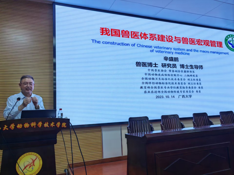 2023年10月14日上午,在太阳成集团122ccvip318报告厅,中国动物疫病预防控制中心原副主任、中国兽医协会副会长兼秘书长辛盛鹏研究员应邀为广大师生做了一场主题为“我国兽医体系建设与兽医宏观管理”的报告。太阳成集团tyc122cc副校长罗廷荣教授主持报告会,会场近300个座位座无虚席。