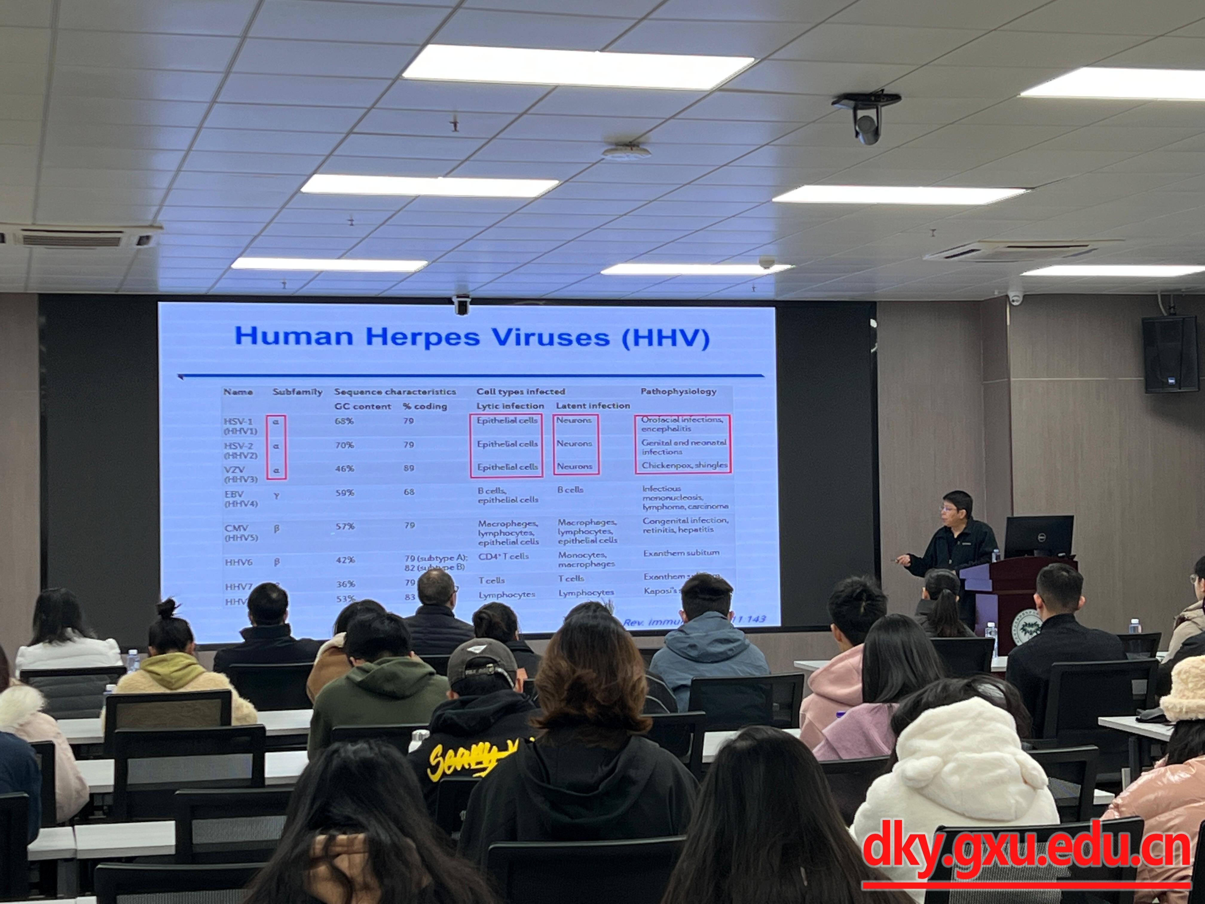 郑春福教授首先介绍了HSV-1感染可以激活宿主细胞的抗病毒天然免疫,然而病毒同时也进化出多种策略来逃逸宿主的抗病毒免疫并建立终身潜伏感染。随后介绍其研究团队有关HSV-1感染与宿主抗病毒固有免疫之间相互作用的研究进展,阐明HSV-1是如何逃避宿主的抗病毒固有免疫的分子机制,为开发治疗的潜在新靶点和可能的抗HSV-1感染疫苗提供科学依据。