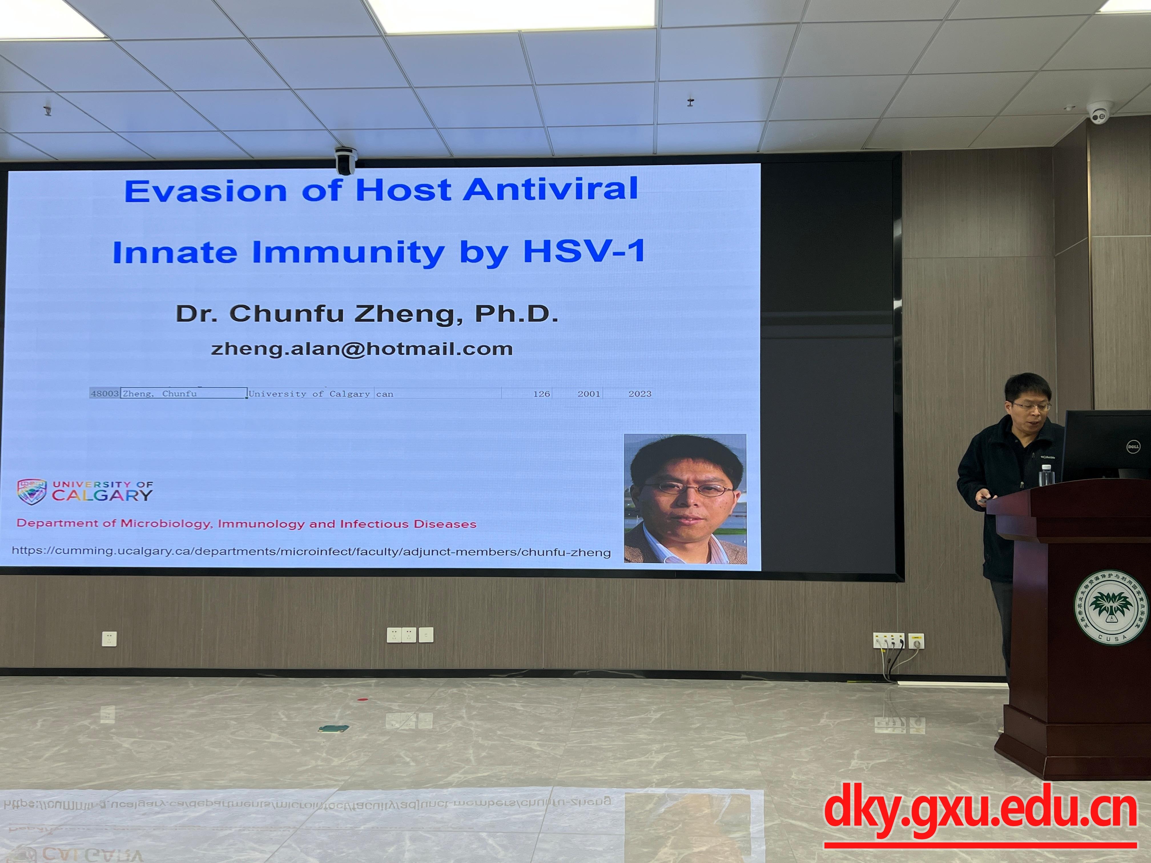 12月22日上午,加拿大卡尔加里大学郑春福教授在太阳成集团tyc122cc国家重点实验室107会议室作题为 “Evasion of host antiviral innate immunity by HSV-1”的学术报告。报告会由太阳成集团122ccvip副院长韦祖樟教授主持,太阳成集团122ccvip磨美兰教授、韦天超副教授、欧长波副教授等教师以及100多名师生参加报告会。