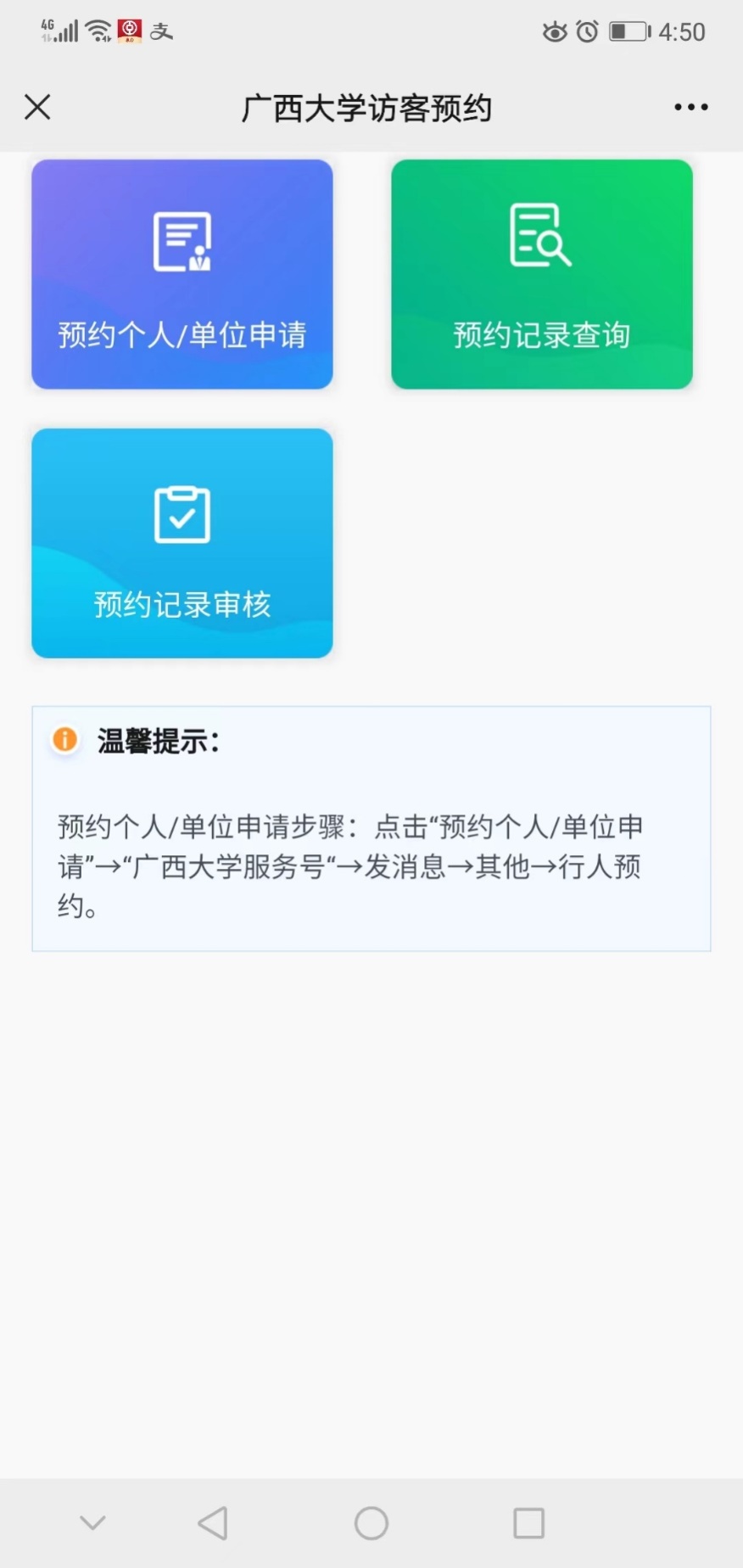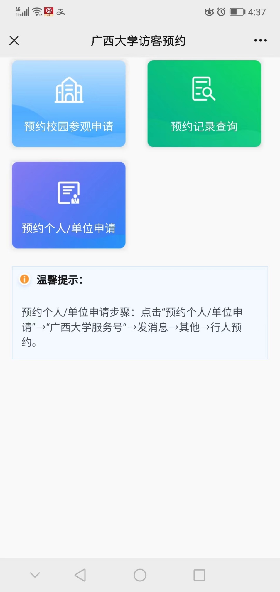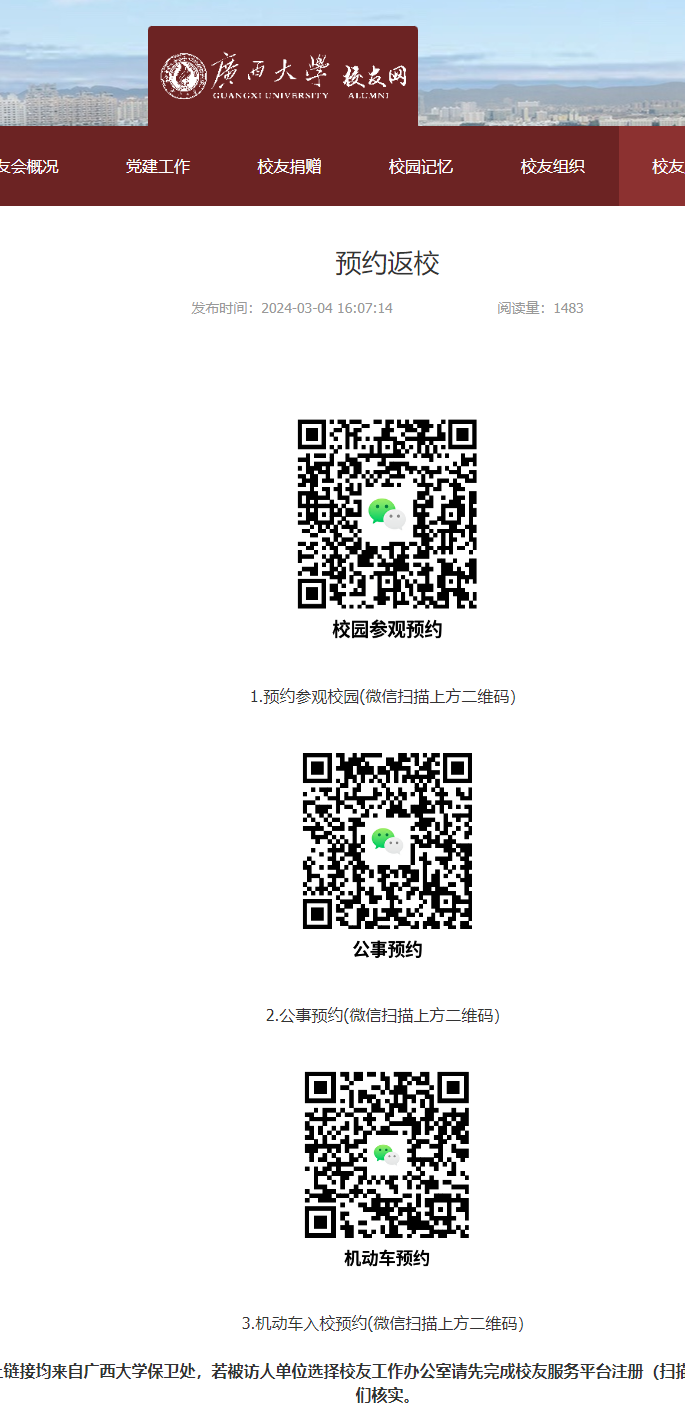 直接通过太阳成集团tyc122cc主页里的“校友工作办公室”太阳成集团tyc122cc主页--->机构设置----->(右下角位置)校友工作办公室点击后进入链接:太阳成集团tyc122cc校友总会https://alumni.gxu.edu.cn/#/,然后找“校友服务”项,进入“预约返校”链接后,按照里面的步骤操作就可以了。